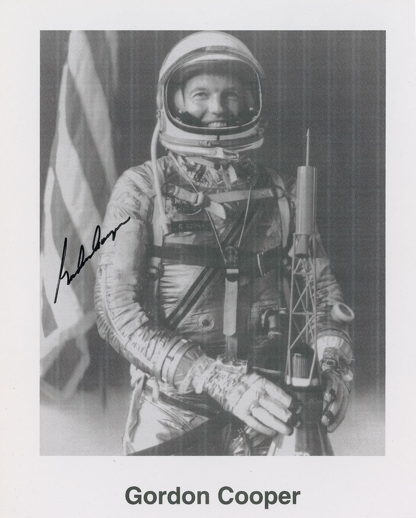 Semi-glossy 8 x 10 paperstock photo of Cooper posing with a capsule model, signed in black felt tip. In fine condition, with a few light surface creases.