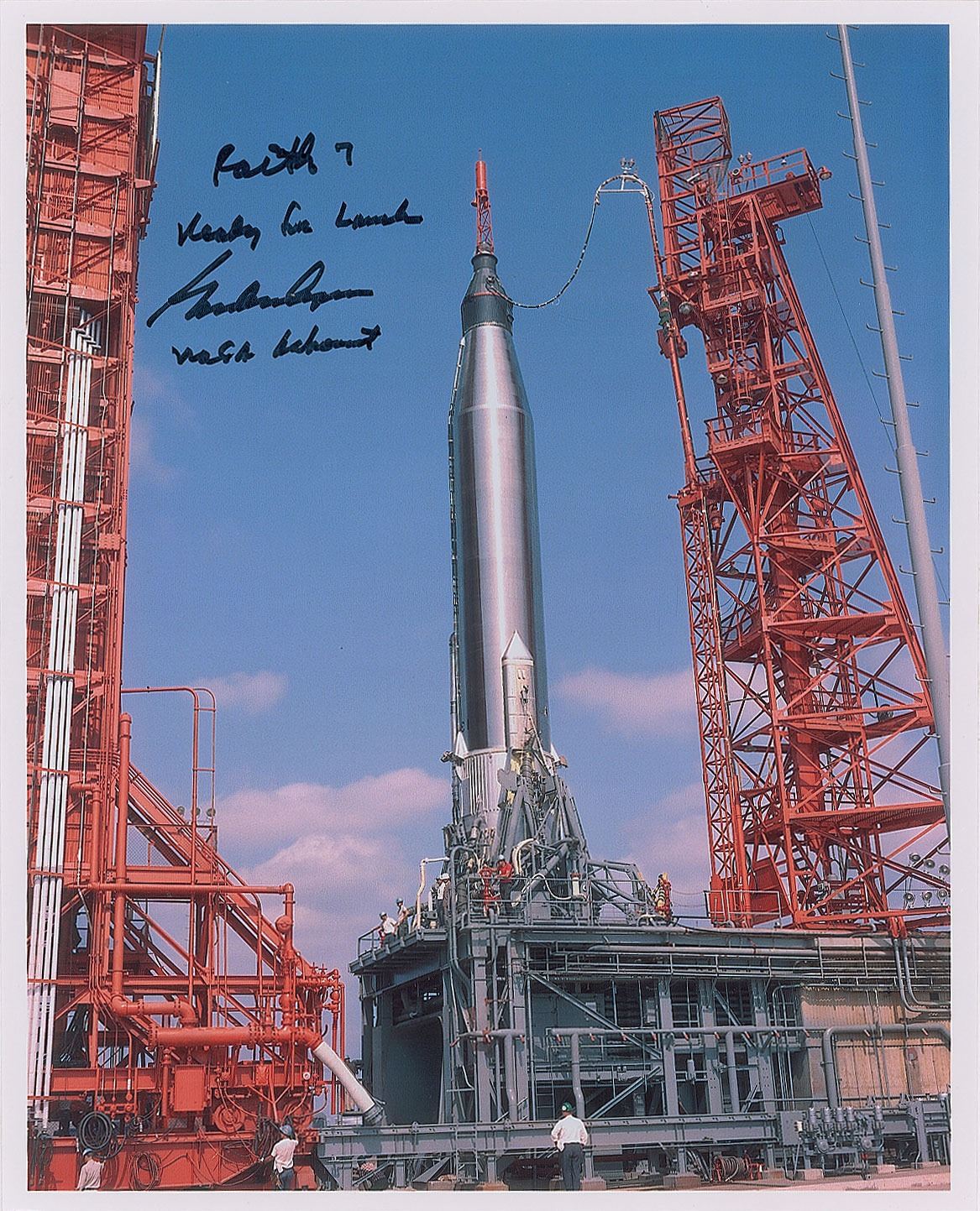 Impressive color satin-finish 8 x 10 photo of the Atlas LV-3B 130-D rocket, the launch vehicle for the Mercury-Atlas 9 mission, signed in black felt tip, "Faith 7, Ready for launch, Gordon Cooper, NASA astronaut." In very fine condition.