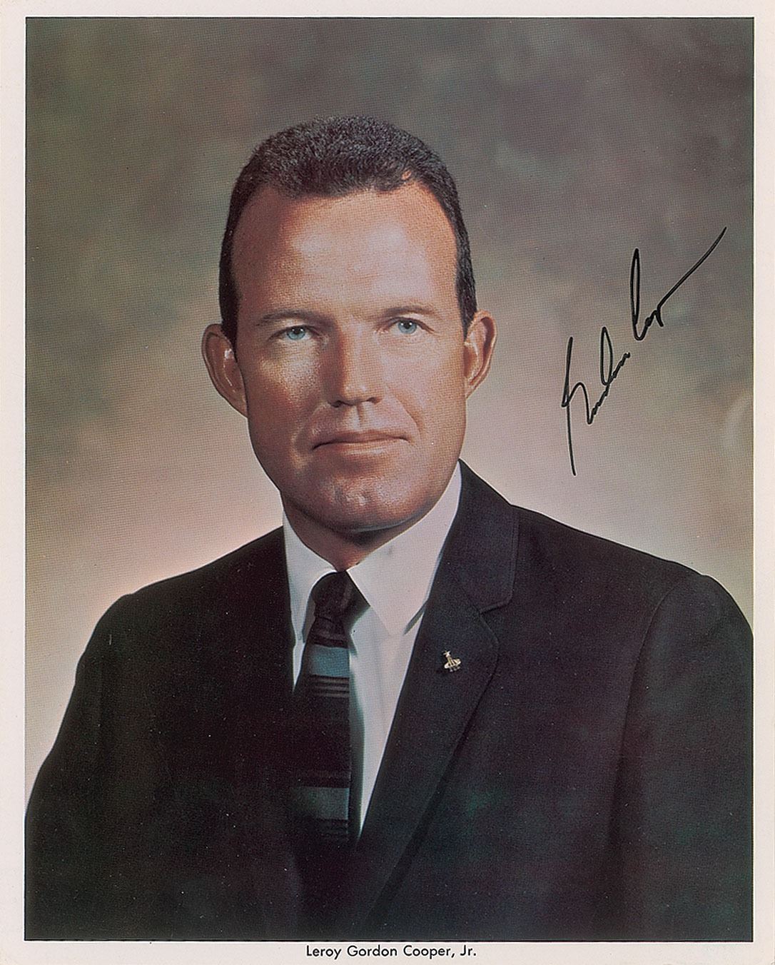 Official color 8 x 10 NASA lithograph of Cooper in a suit and tie with an astronaut pin on his lapel, signed in black felt tip. In fine condition.