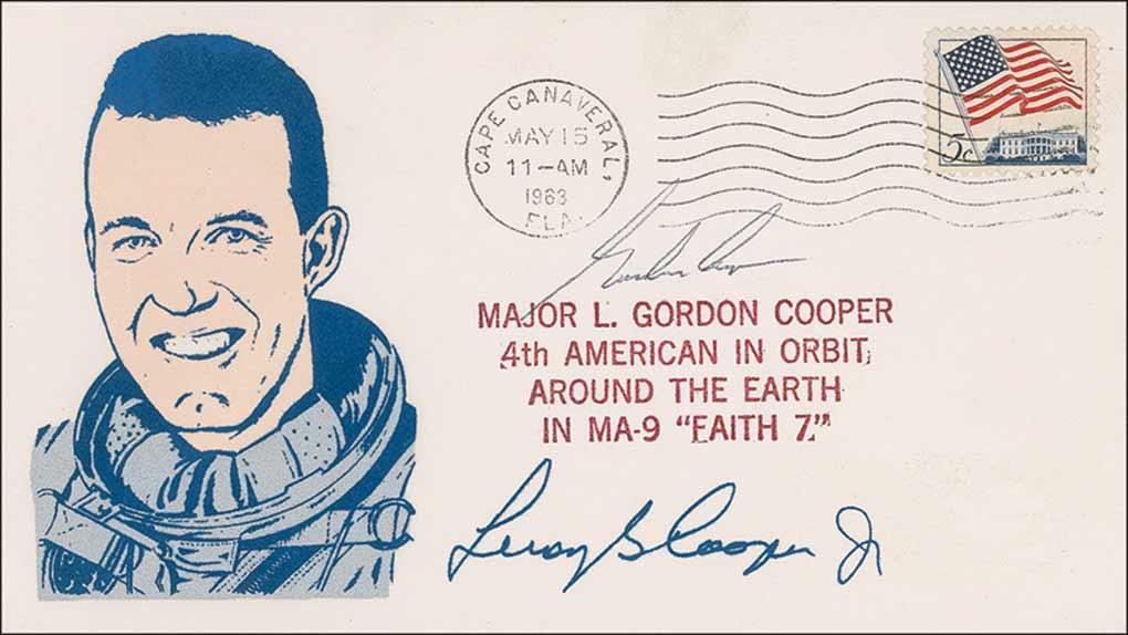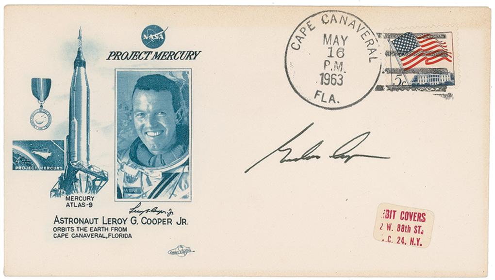 Two commemorative launch and recovery covers, with cachets honoring Cooper’s Mercury mission, each signed in black ink by Cooper. One cover also bears a printed facsimile signature. In fine condition, with label remnant to one cover.