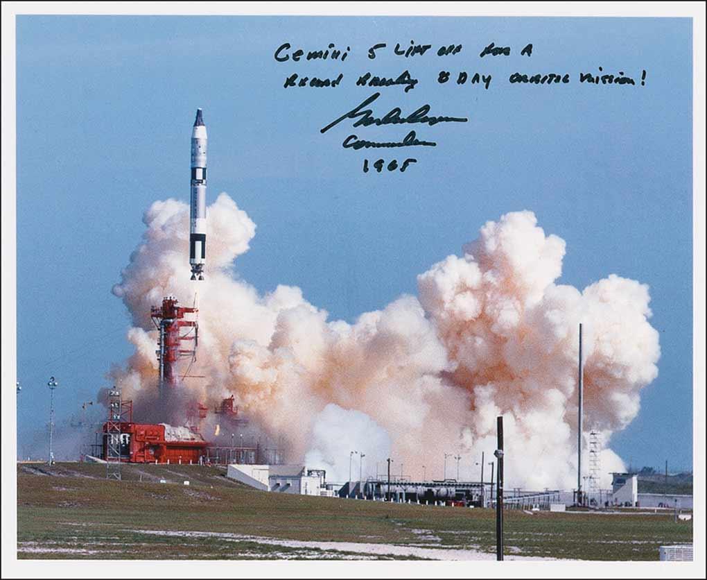 Color satin-finish 10 x 8 photo of the liftoff of Gemini 5, signed in black felt tip, “Gemini 5 lift off for a record breaking 8 day orbital mission! Gordon Cooper, Commander, 1965.” In very fine condition.