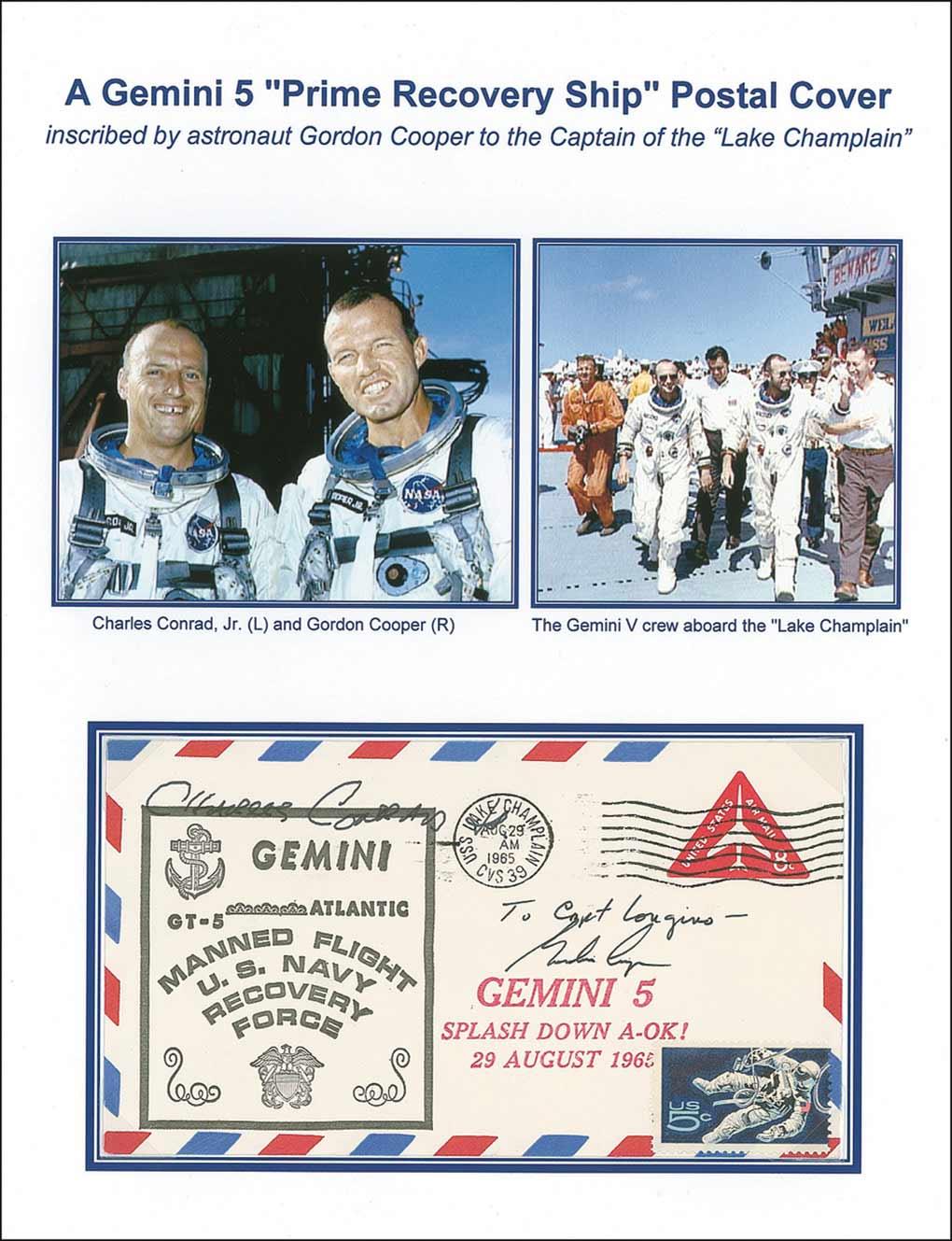 Prime recovery ship postal cover honoring the naval recovery force of Gemini 5, signed and inscribed in black ink to the Captain of the Lake Champlain, “To Capt. Longins—Gordon Cooper.” Cover also bears a Charles Conrad autopen signature to upper left corner. Removably presented on a color 8.5 x 11 informational sheet. In fine condition.