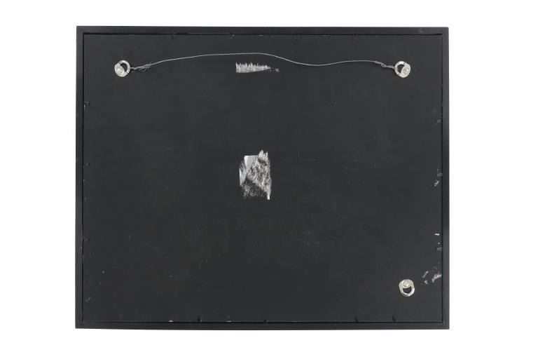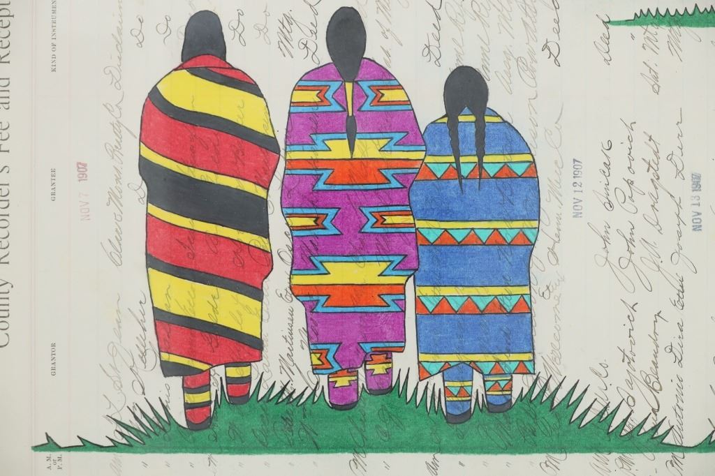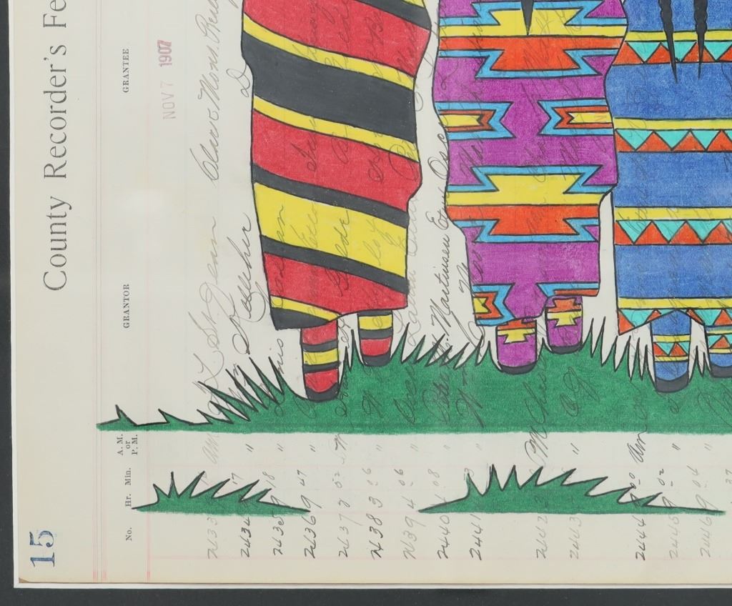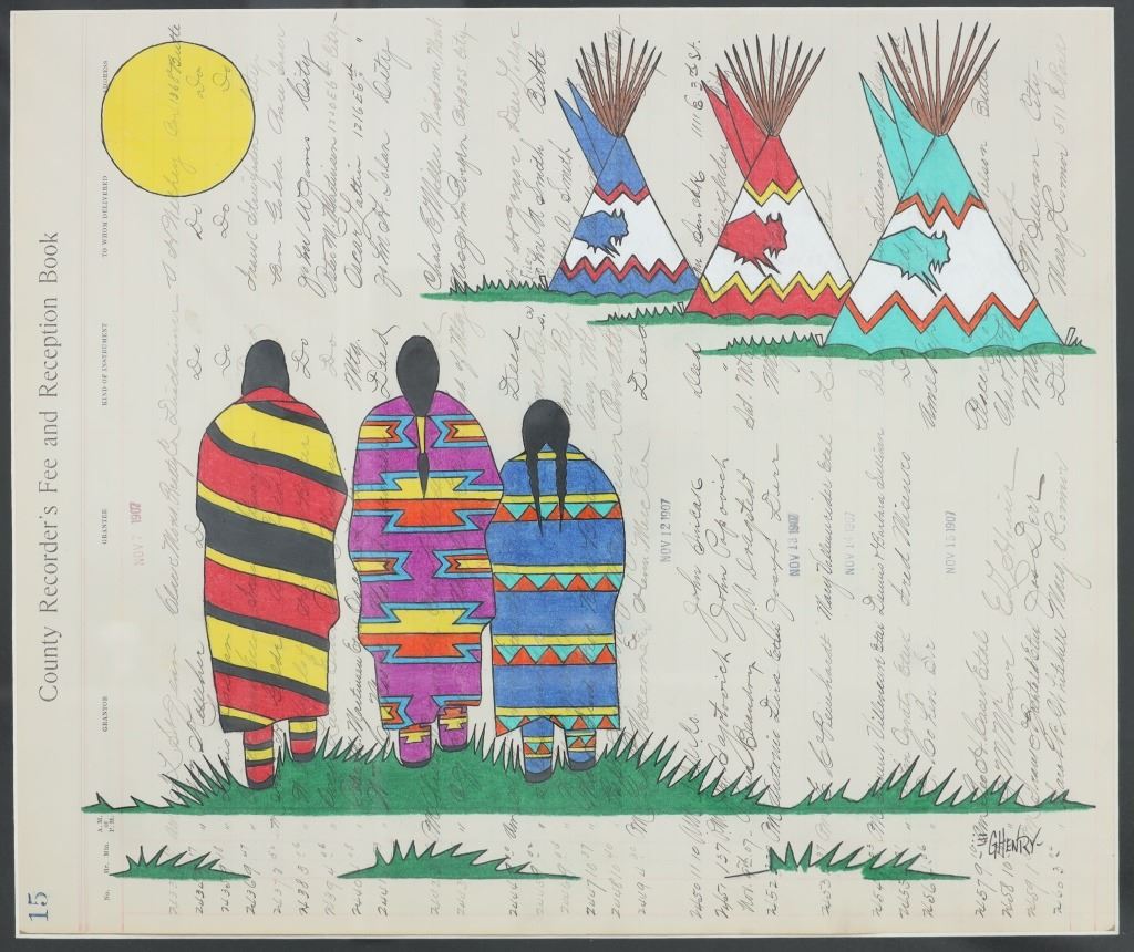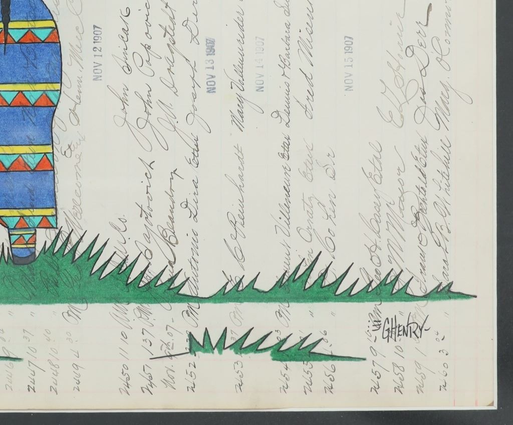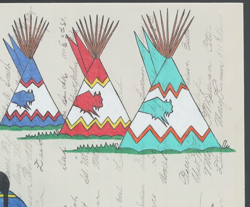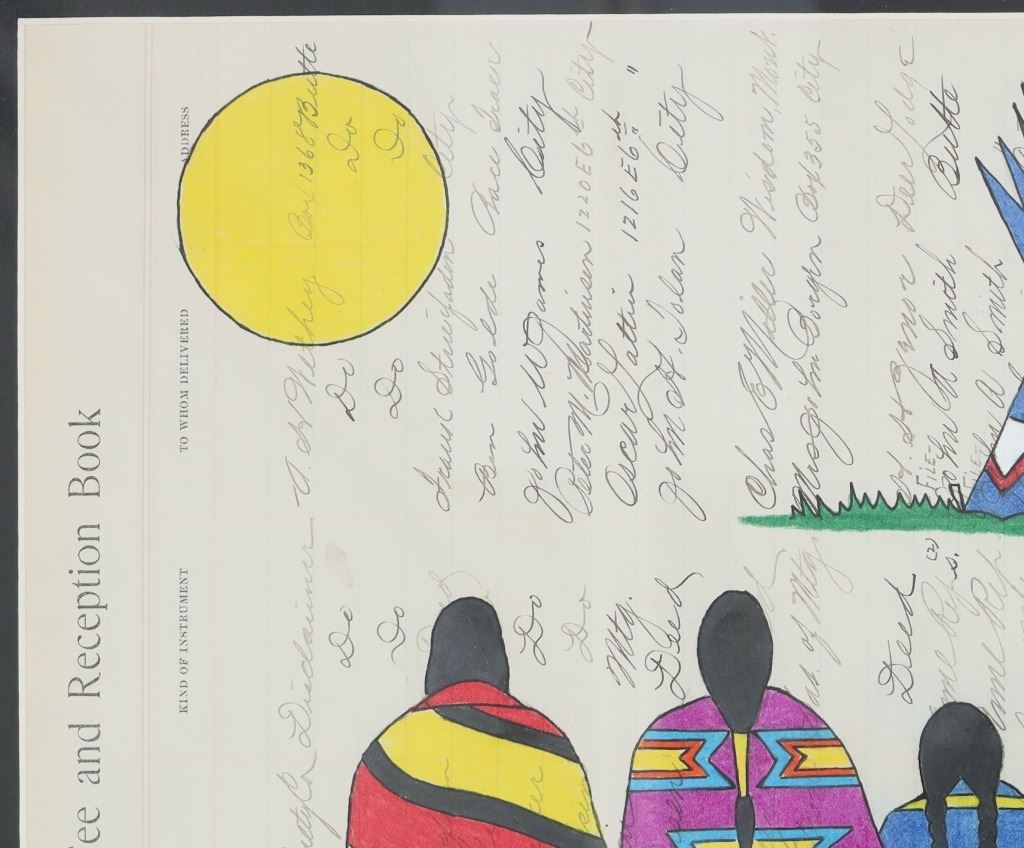 Featured in this lot is this beautiful framed ledger art done by Spokane artist Gordon Henry, a Chippewa Cree / Blackfeet artist circa 2010s. Gordon Henry was born in Box Elder, Montana and studied Visual and Media Arts at the University of Montana in Missoula. He now resides in Spokane, Washington. The ledger art has been done on a 1907 County Recorder's Fee and Reception Book page and shows a group of three Native Americans standing on grass wearing colorful trade blankets. They are looking into the distance at three teepees, designed with buffalo graphics. The sun shines down on them from the top left corner. The bottom right shows the artist's signature reading, "G. Henry" in black ink. The piece has been set in a black colored frame and has been matted once with black matting paper. The piece shows good condition overall with little to no wear present. The visible art measures 13 9/16" L x 16 1/8" W. The entire piece measures 16 7/8" L x 20 7/8" W x 11/16" D. It weighs 3 pounds and 10 ounces.