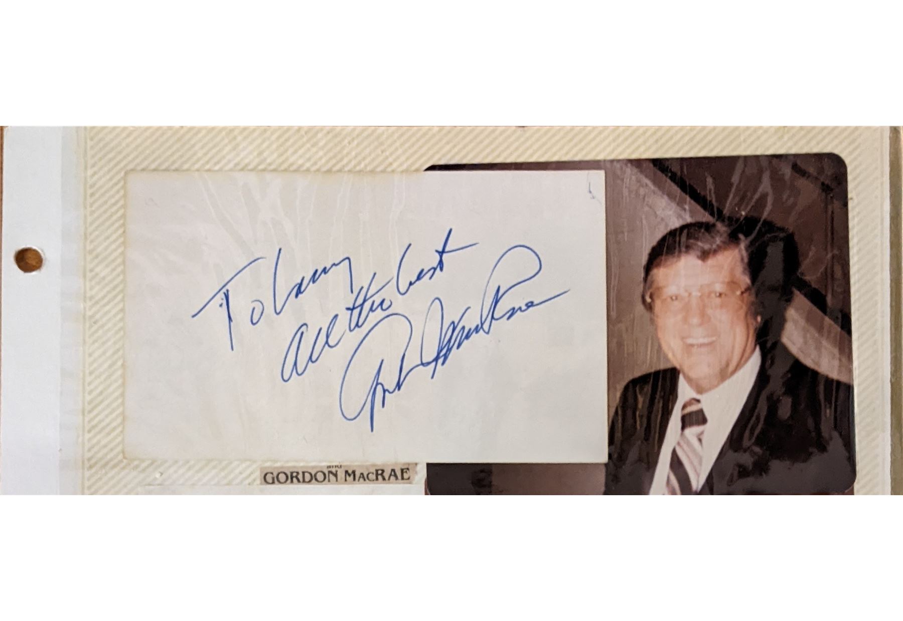 Gordon MacRae Original Signature and Photo. From backstage at the Merv Griffin Show. 1980's. 3x5 inches All of these pictures were taken backstage and are one of a kind photos with no copies made