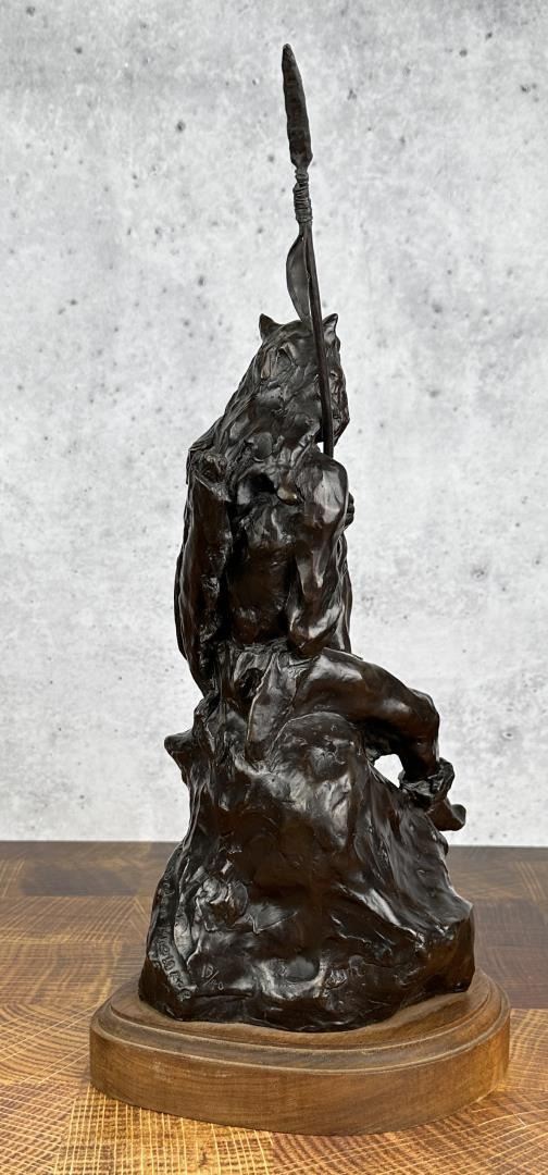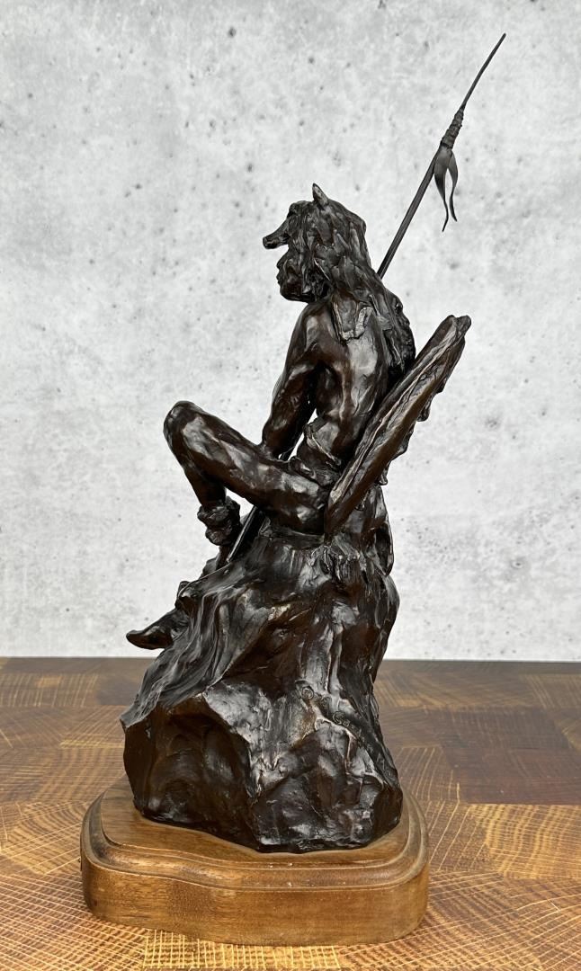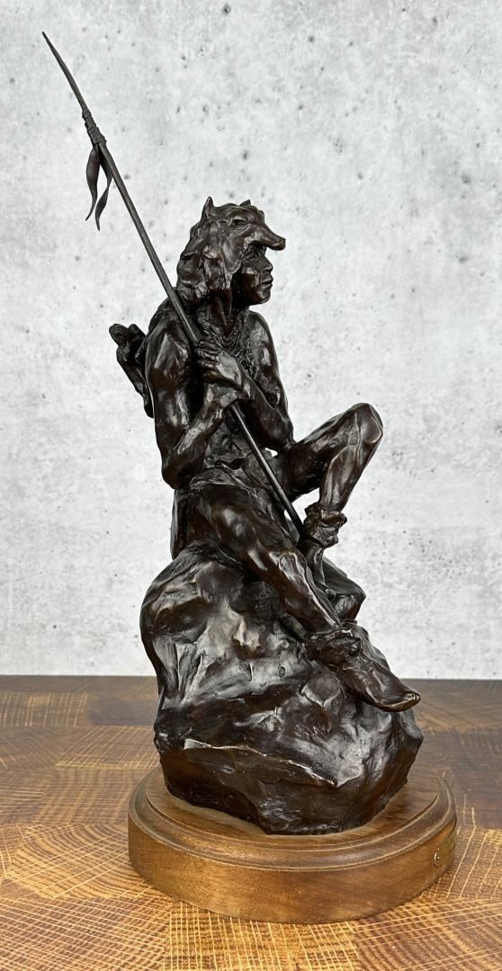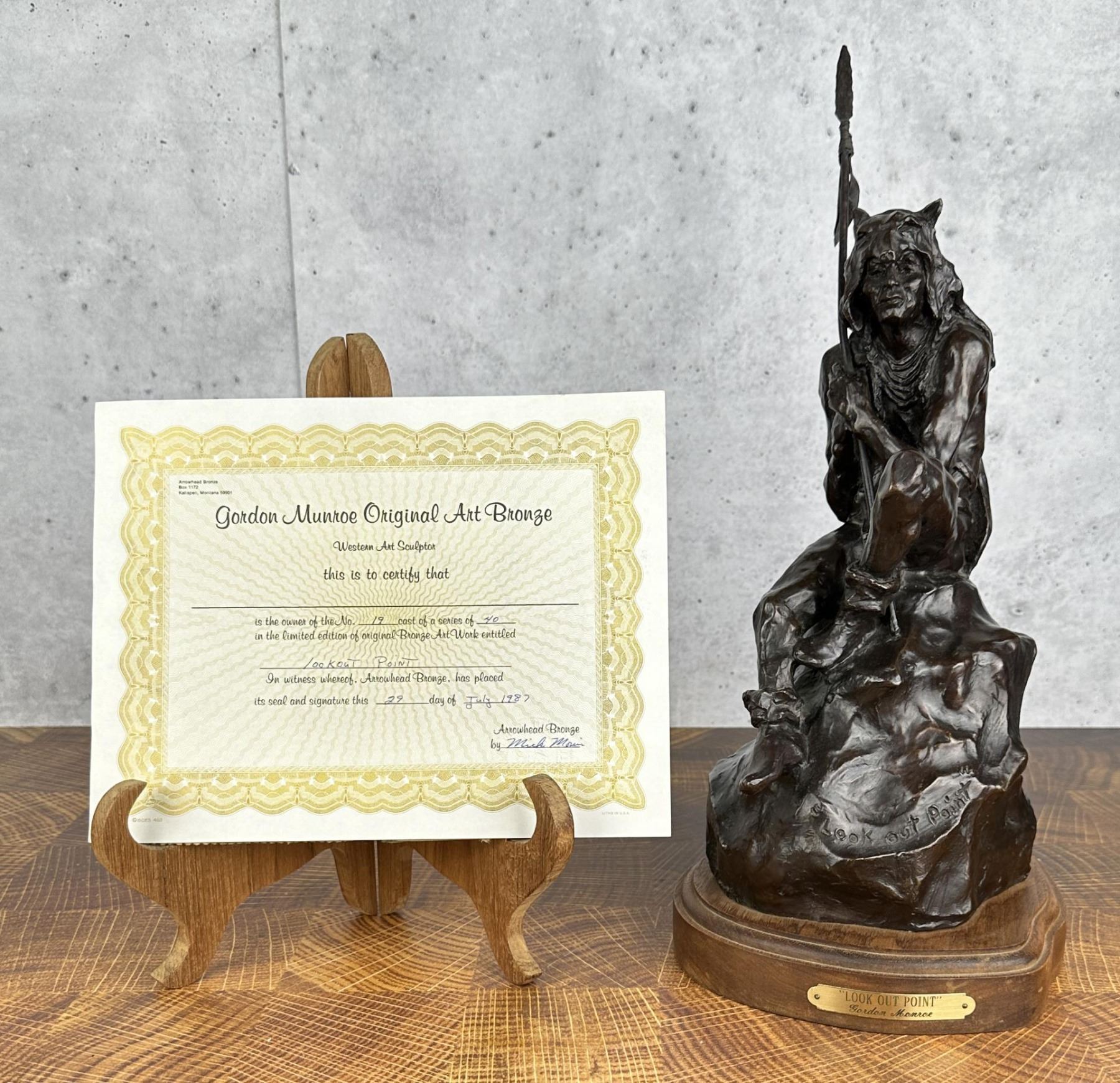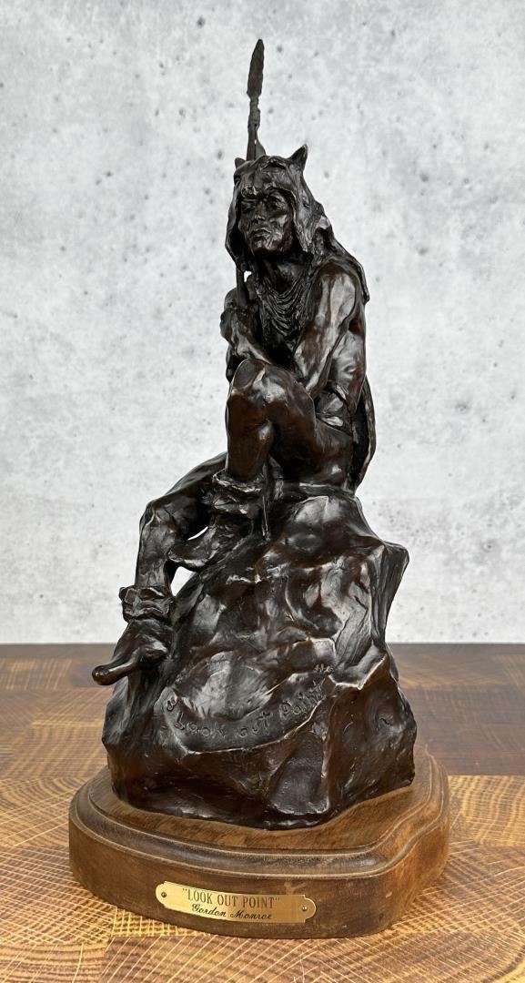 Title is Lookout Point. Comes with COA. 14 1/4" by 8 1/8" by 7 5/8". Gordon Monroe (Born 1946) is active/lives in Montana. Gordon Monroe is known for Sculpture. Gordon Monroe, an enrolled member of the Blackfeet Tribe, was born in 1946 in Browning, Montana, on the Blackfeet Reservation. Gordon graduated from the Browning Public School System, and earned a 2-year business degree from Blackfeet Community College. In addition to a 40 year career as a professional artist, Gordon serves on the Blackfeet Honorary Advisory Council researching topics such as water, land, and land recovery efforts for the Blackfeet Tribe. In his early career, Gordon held various jobs in the area before he began work at the Big Horn Art Foundry in Browning in 1968. The foundry was owned and operated by Robert Scriver, a nationally known western sculptor. Because of its location and distance from urban centers, the foundry employed many Blackfeet tribal members. Working under Scriver's supervision, Gordon was offered the unique opportunity to learn the entire spectrum of lost wax casting, from the creation of the clay model to the pouring of the finished bronze. As his knowledge and expertise in its techniques grew, so did his interest in the art form. This led Gordon to begin working in clay at home. As Gordon became a more confident sculptor, he began using his acquired skills to cast and exhibit his artwork. He works with water clay to produce ceramic sculptures, oil clay to produce bronze sculptures, and fiberglass for much larger pieces. The inspiration he draws from historical sources and discussions with elders influence the style of his sculpture. In 1973, Gordon Monroe's sculpture was featured in his first solo exhibition at the Museum of the Plains Indian. Over the next several decades, his work received national acclaim and has been featured in exhibitions at: the C.M. Russell Museum, Great Falls, Montana; Native American Museum of Art, Spokane, Washington, the Montana Historical Society, Helena, Montana, and the Heard Museum, Phoenix Arizona.