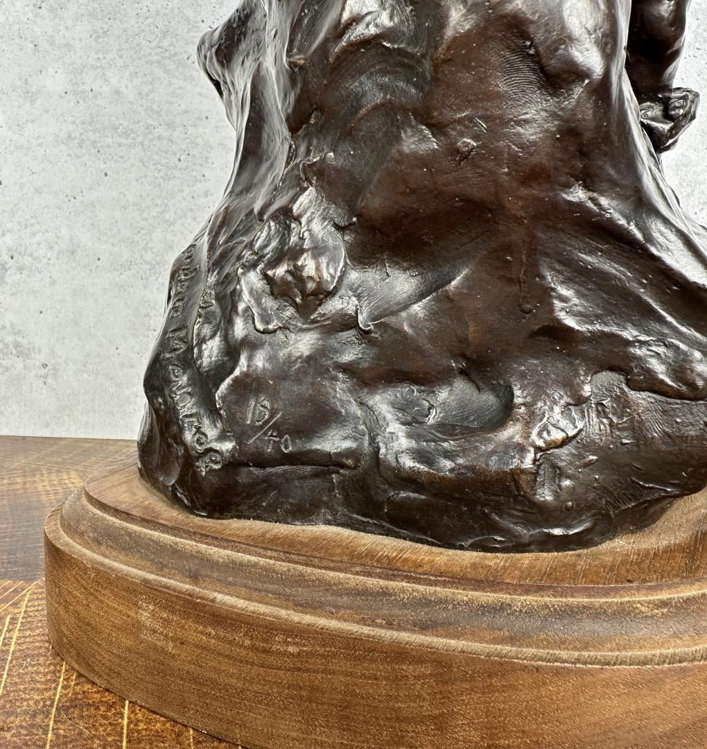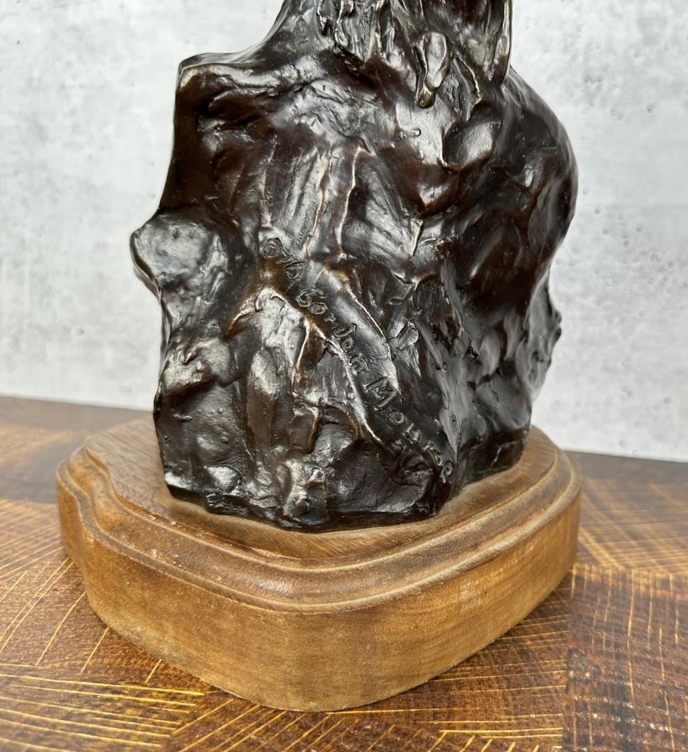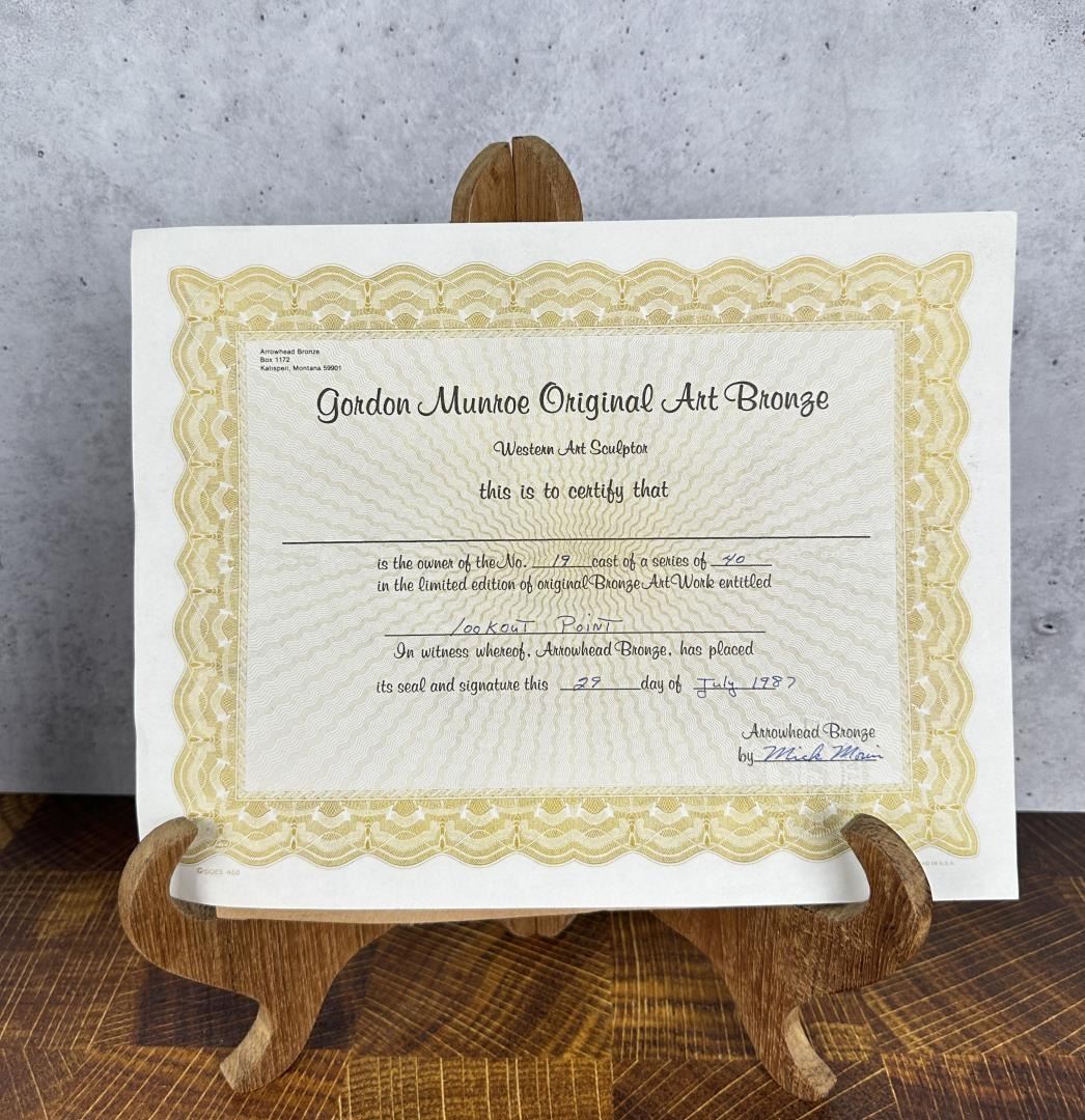 Title is Lookout Point. Comes with COA. 14 1/4" by 8 1/8" by 7 5/8". Gordon Monroe (Born 1946) is active/lives in Montana. Gordon Monroe is known for Sculpture. Gordon Monroe, an enrolled member of the Blackfeet Tribe, was born in 1946 in Browning, Montana, on the Blackfeet Reservation. Gordon graduated from the Browning Public School System, and earned a 2-year business degree from Blackfeet Community College. In addition to a 40 year career as a professional artist, Gordon serves on the Blackfeet Honorary Advisory Council researching topics such as water, land, and land recovery efforts for the Blackfeet Tribe. In his early career, Gordon held various jobs in the area before he began work at the Big Horn Art Foundry in Browning in 1968. The foundry was owned and operated by Robert Scriver, a nationally known western sculptor. Because of its location and distance from urban centers, the foundry employed many Blackfeet tribal members. Working under Scriver's supervision, Gordon was offered the unique opportunity to learn the entire spectrum of lost wax casting, from the creation of the clay model to the pouring of the finished bronze. As his knowledge and expertise in its techniques grew, so did his interest in the art form. This led Gordon to begin working in clay at home. As Gordon became a more confident sculptor, he began using his acquired skills to cast and exhibit his artwork. He works with water clay to produce ceramic sculptures, oil clay to produce bronze sculptures, and fiberglass for much larger pieces. The inspiration he draws from historical sources and discussions with elders influence the style of his sculpture. In 1973, Gordon Monroe's sculpture was featured in his first solo exhibition at the Museum of the Plains Indian. Over the next several decades, his work received national acclaim and has been featured in exhibitions at: the C.M. Russell Museum, Great Falls, Montana; Native American Museum of Art, Spokane, Washington, the Montana Historical Society, Helena, Montana, and the Heard Museum, Phoenix Arizona.