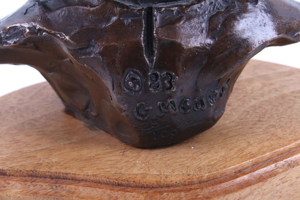 For your consideration in this lot we have original bronze bust of Sitting Bull by Blackfeet artist Gordon Monroe. The piece is titled "Sitting Bull" and shows Sitting Bull with a beaded necklace. The sculpture is marked across the front reading "Sitting Bull". The back of the piece is marked "c 83 G. Monroe". Additionally, the bronze is numbered 25/100 across the back. The statue is set onto a wood base. The Gordon Monroe bronze sculpture is in good condition. It measures 5 3/4" tall with the base measuring 5 3/8" wide by 3 1/2" deep.