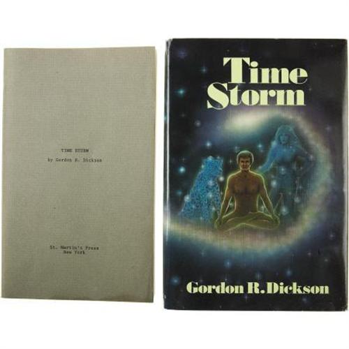 <B>Gordon R. Dickson. </B></I><B><I>Time Storm</B></I></B></I><B> and </B></I><B><I>Time Storm</B></I></B></I><B> Advance Proof.</B></I> New York: St. Martin's Press, 1977.<BR> <BR>First edition and advance proof copy. Octavo. 342 and 301 pages respectively.<BR><BR>The first edition in publisher's original blue boards with gilt titles on the spine. Corners bumped. Faint stain running along the bottom edge of the boards. Front hinge cracked but contents tight and bright. Dust jacket bright. Advance proof copy in printed wrappers with publisher's announcement affixed to the title page. Slight toning to pages. Hardcover edition in good condition; advance proof in fine condition. <I>From the Robert and Diane Yaspan Collection.</B></I><BR><BR><b>Shipping:</b> Books & Catalogs (<a target="_blank" href="http://www.heritageauctions.com/common/shipping.php">view shipping information</a>)