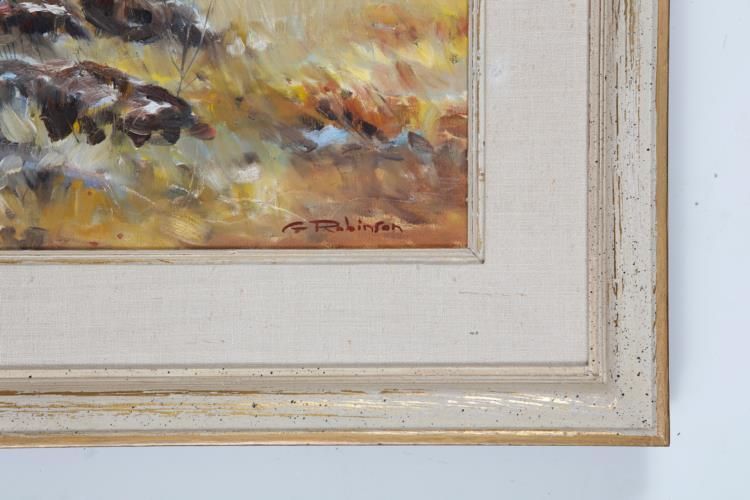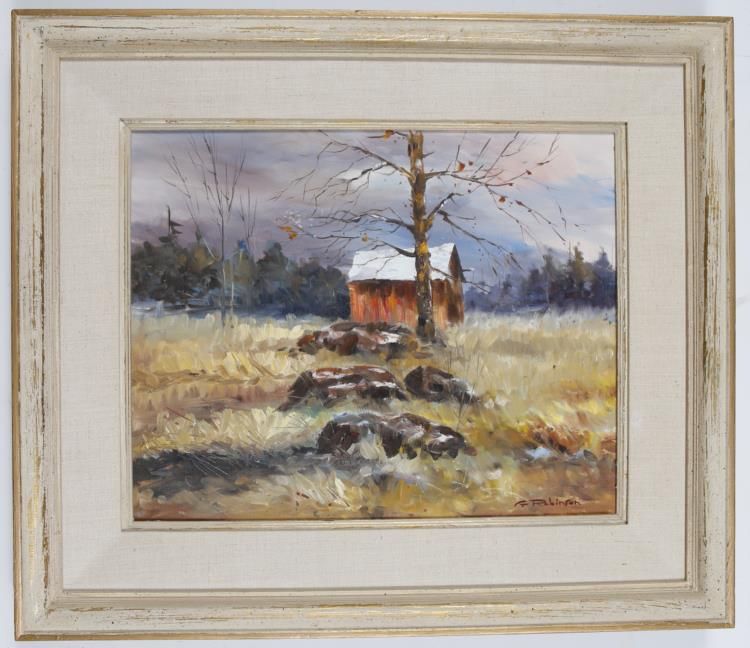 Up for sale we have a Gordon Robinson Farm Landscape Painting that is acrylic on canvas wrapped board and beautifully framed. The frame size is 24.25" x 28" and the image size is 16" x 20".