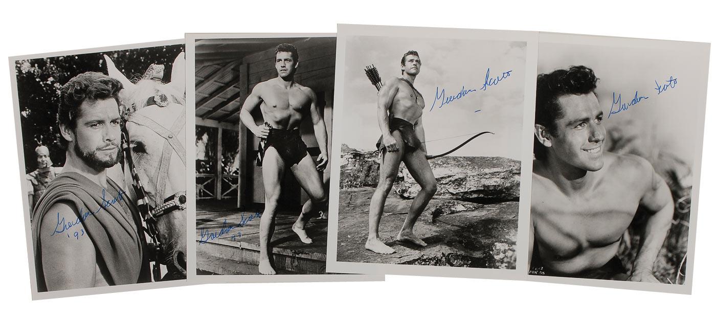 Four different glossy 8 x 10 photos of Scott, including three as Tarzan, each signed in blue felt tip. In fine condition.