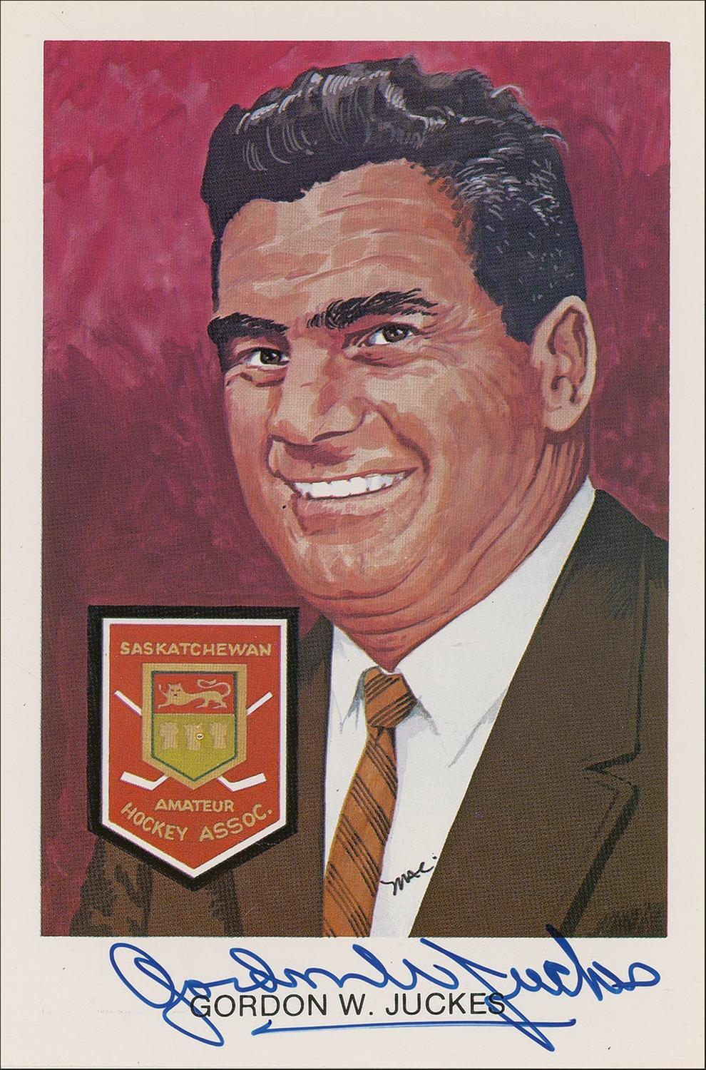 Hockey Hall of Famer (1914-1994) who was a guiding force in the development of youth hockey. Color 4 x 6 Hockey Hall of Fame postcard photo, signed in blue felt tip. In fine condition, with a couple of light surface bends and postal impressions along right edge.