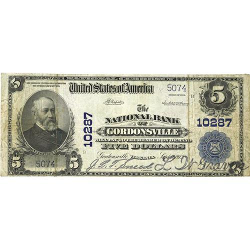 <B>Gordonsville, VA</B></I> - $5 1902 Plain Back Fr. 602 <B>The NB of Gordonsville</B></I> Ch. # 10287<BR>Two large are shown in the Kelly census with this newcomer having wonderful stamped signatures of Cashier Sneed and President Graves. The bright surfaces give way to a few hard folds and a bit of wallet soiling on the face. Only the second public offering from here. <B>Very Fine.</B></I>