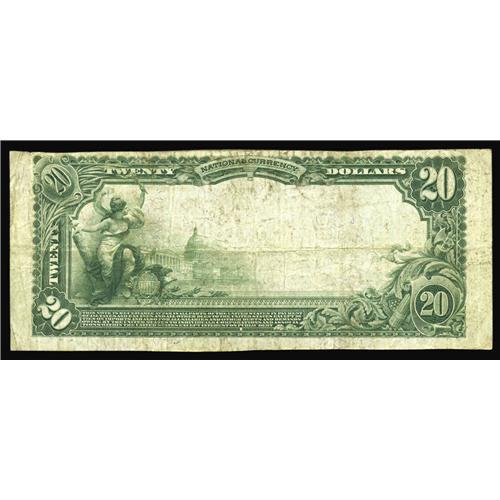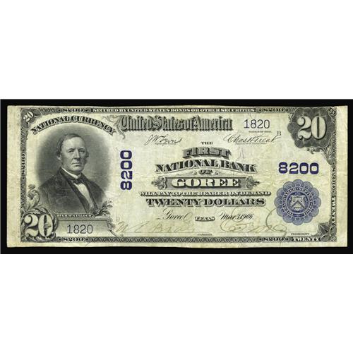 <B>Goree, TX</B></I> - $20 1902 Plain Back Fr. 651 <B>The First NB</B></I> Ch. # 8200<BR>This is just the second note reported from this excessively rare west Texas community. Both notes represent a miracle of survival, as this town was not represented in any of the great Texas collections formed in the past two generations, including Philpott, Everson, Irish, or Ivy. This was one of the smallest and most thinly capitalized banks in Texas, and had just $670 in large notes outstanding in 1935. The first note from here sold last year as part of the Permian Basin collection and realized a well into five figure price. This piece, in just about the same grade, will likely to as well or better. Pen signed <B>Very Fine.</B></I>