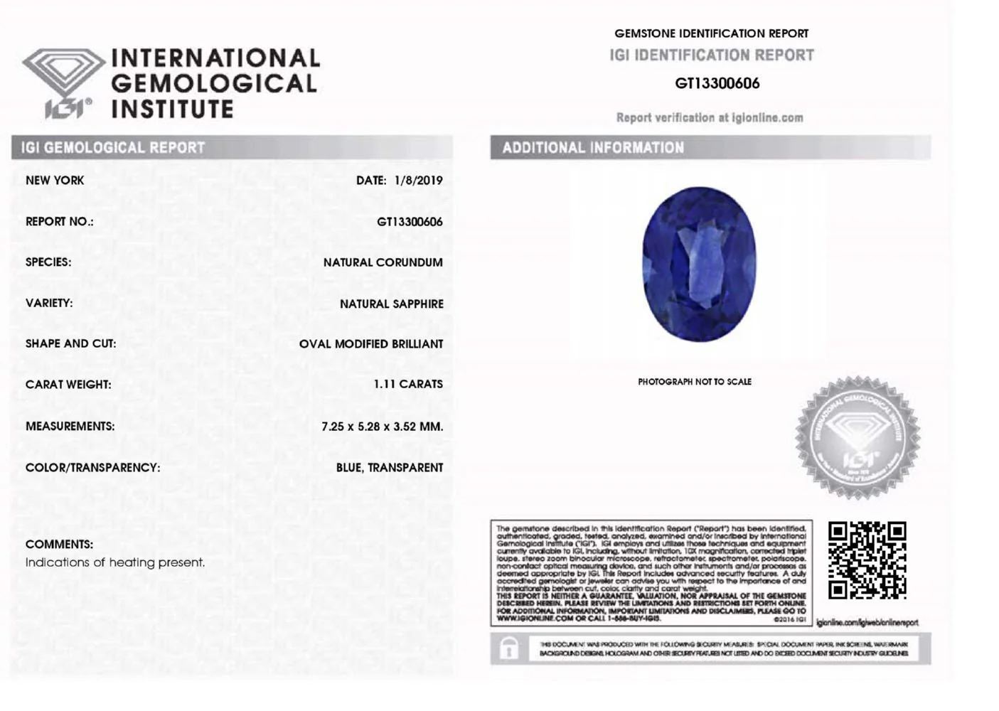 Pretty 1.11 Ct Blue Sapphire is an oval brilliant cut measuring 6.78 x 5.25 x 3.66 mm. Reveals a stunning hue. Ready to mount and be shown off! Origin: Sri Lanka. Treatment: Heat only. Please see the certification for additional information.