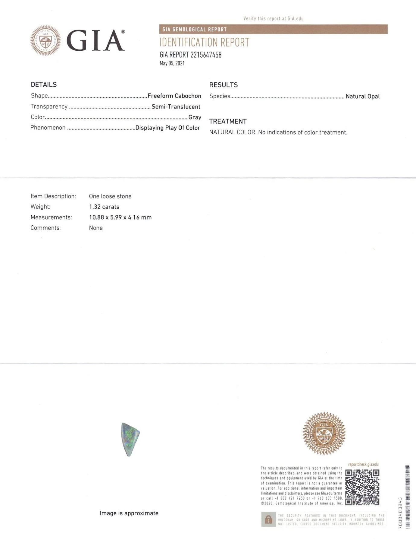 Unique 1.32 Ct Grey Opal measuring 10.88 x 5.99 x 4.16 mm with a freeform cabochon cut. The natural color on this opal is beyond stunning! Origin: Australia. Treatment: None. Please see the certification for additional information.
