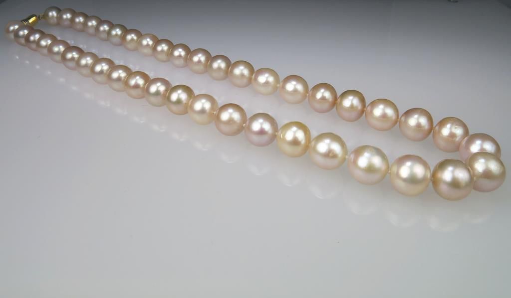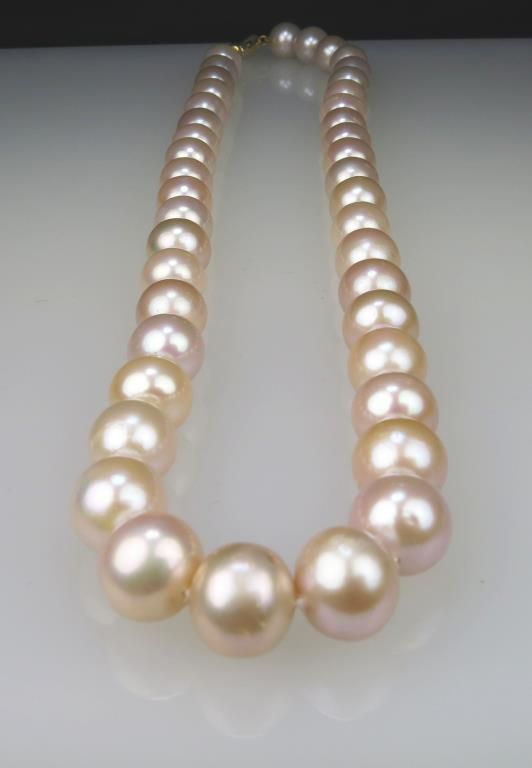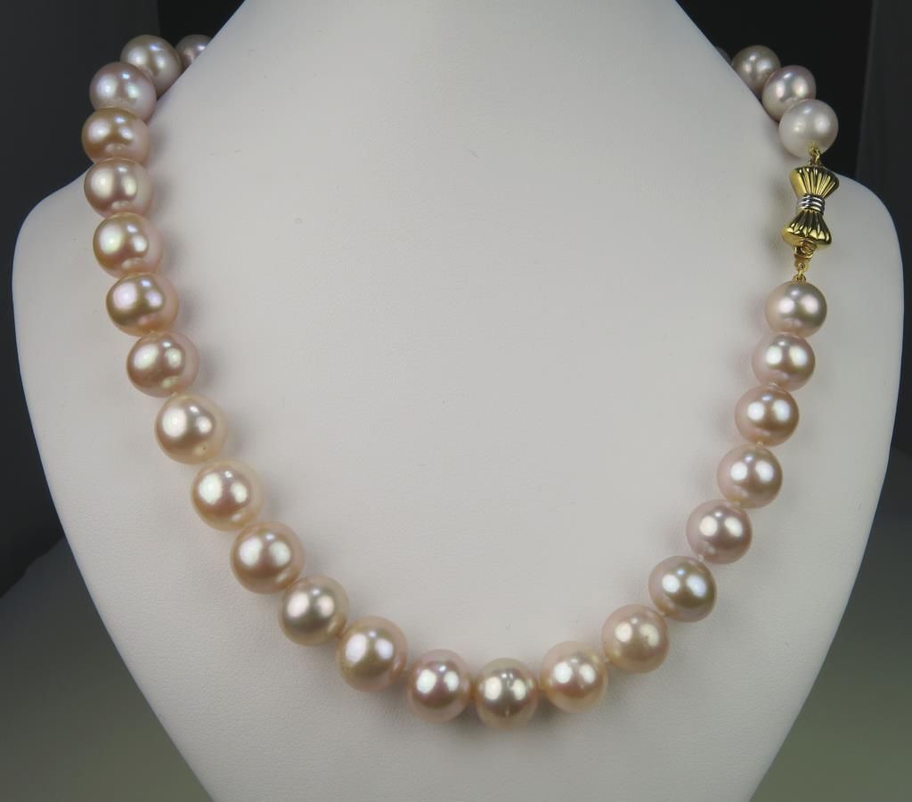 Gorgeous 10.00-11.00mm Natural Color Rose Pink Pearls with wonderful luster, strand measures 18" in length with Bow style two-tone 14 karat gold clasp. Comes with nice gift box. Retail $3,000-$4,000 Estimate $2,000-$3,000.
