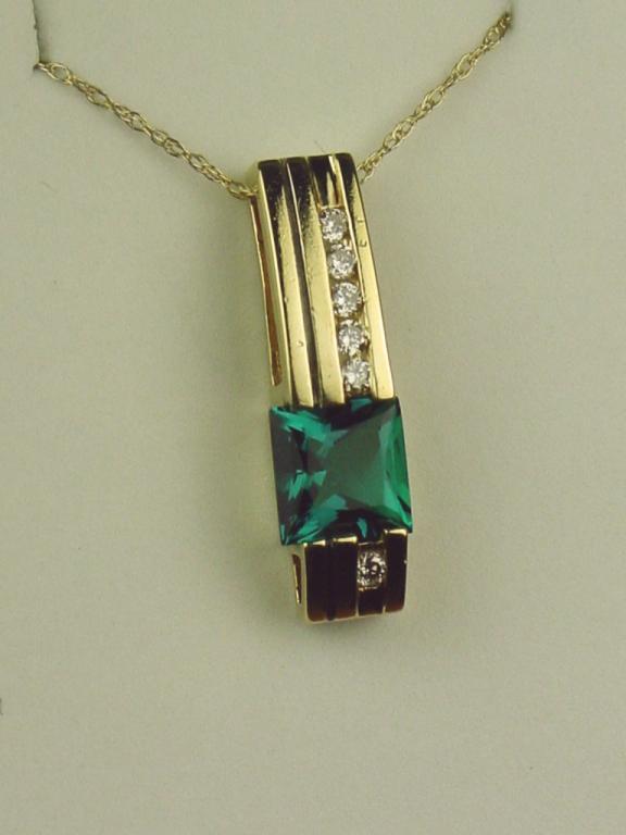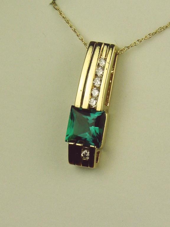 Gorgeous 10 karat yellow gold ladies custom made pendant fine set with a center Chatham type created emerald and channel set with six round diamonds of G-H colors and VS clarity. Retail $995.00 Estimate $200-$400