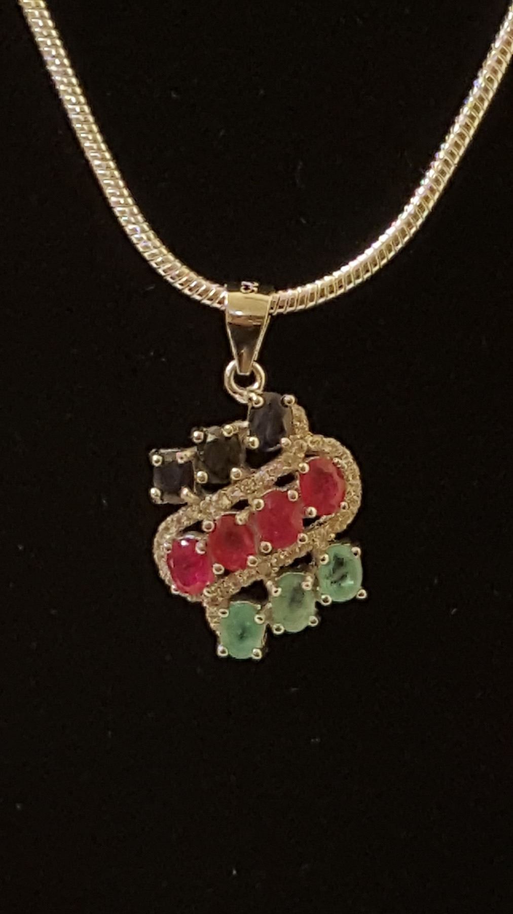 Gorgeous 11.5 ct Blue Sapphire, Ruby and Emerald Pendant Mounted In Solid .925 Sterling Silver. Pendant Includes 20 2 mm. Chain. 57 cttw.