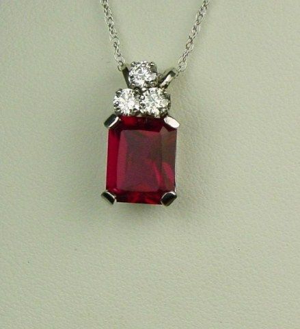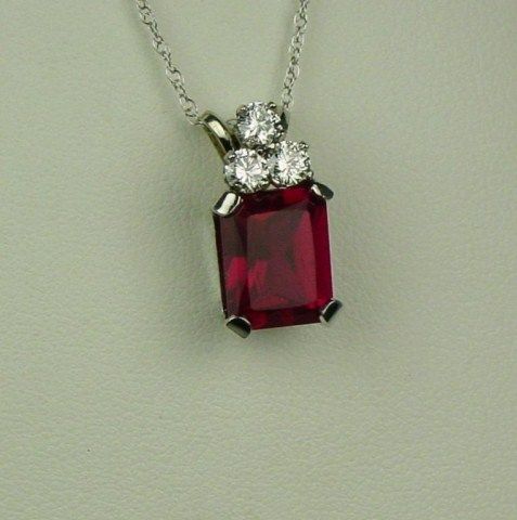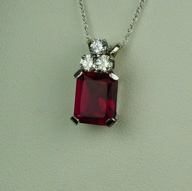 Gorgeous 14 karat white gold ladies pendant set with an emerald cut created Ruby weighing approx. 8.00-10.00 carats and three round ‘IDEAL’ cut diamonds weighing approx. 0.45 carats of G-H colors and VVS/VS clarity.Retail $1,200-$1,800 Estimate $600-$900 Nice