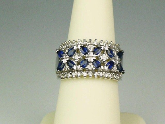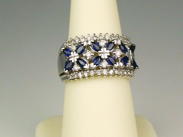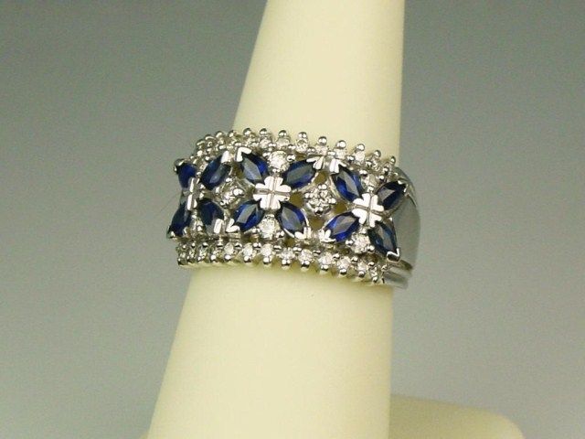 Gorgeous 14 karat white gold ladies ring set with 34 round brilliant cut diamonds weighing approx. 0.40 carats of G-H colors and SI clarity and 12 MQ cut blue sapphires accents. Retail $2,000-$2,500 Estimate $1,200-$1,800Labor intensive
