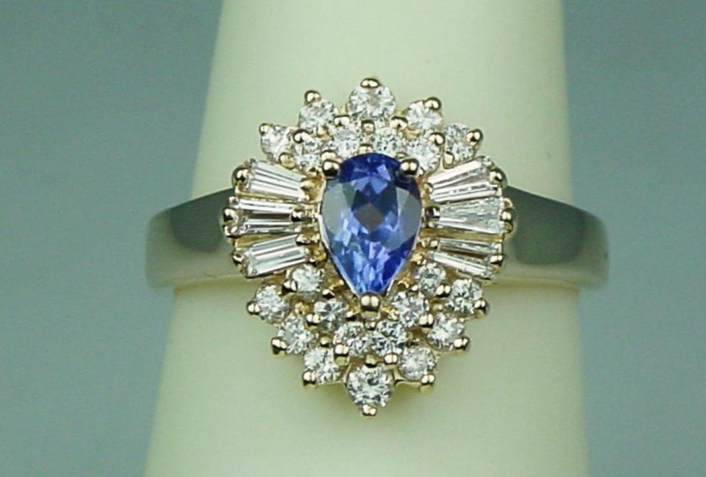 Gorgeous 14 karat yellow gold ladies ballerina design ring fine set with a center pear shape Tanzanite weighing approx. 0.80 carats and surrounded by round and baguette cut diamonds weighing approx. 1.00 carat ofF-G colors and mostly VS clarity. Retail $3,250.00 Estimate $1,200-$2,000