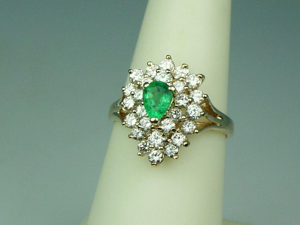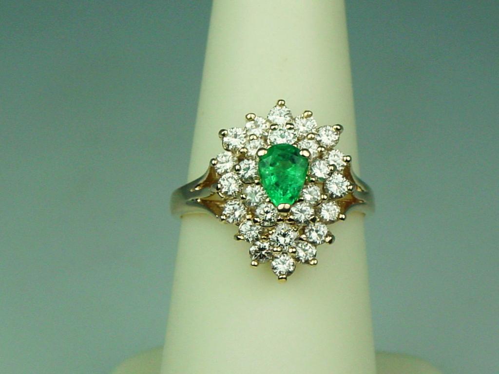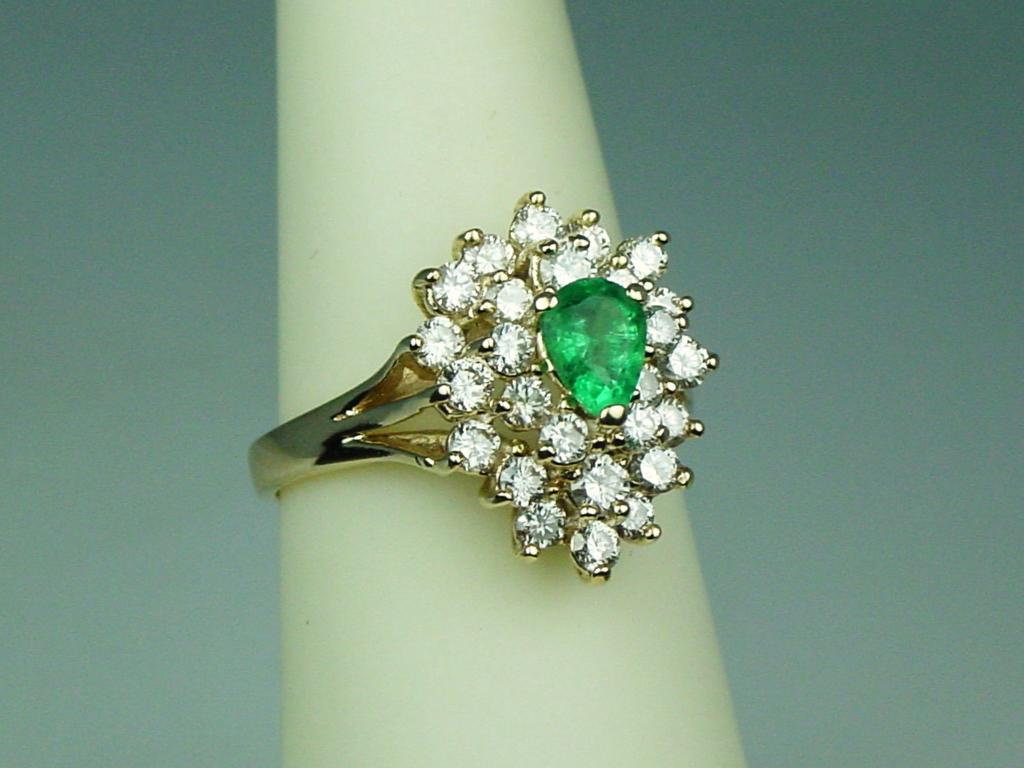 Gorgeous 14 karat yellow gold ladies ring made by “SPARK’ creations set with a center fine green Emerald weighing approx. 0.70 carats and surrounded by 26 round ‘Ideal Cut’ diamonds weighing over 1.00 carat of F-Gcolors and mostly VS clarity. Retail $3,450.00 Estimate $1,000-$2,000