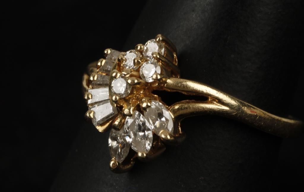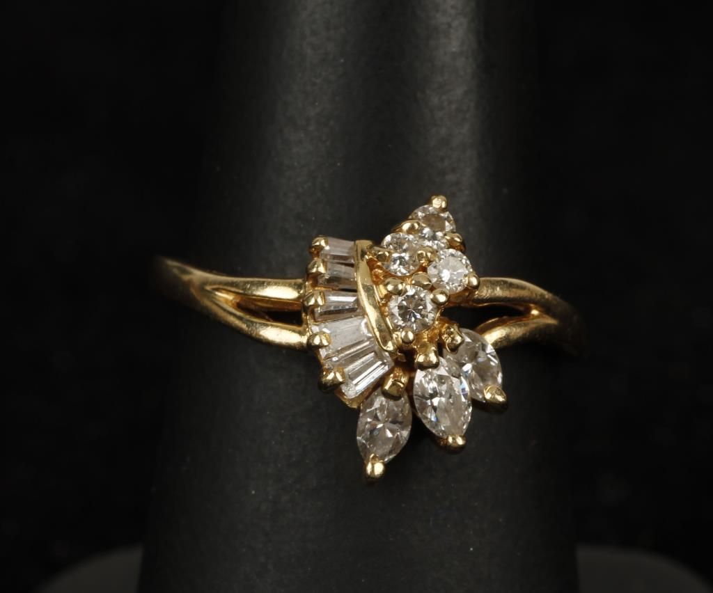 The diamonds consist of 3 marquise, 4 round, and 5 tapered baguettes, all VS/SI and H/I in color. The ring is size 6 and weights 2.4 grams.