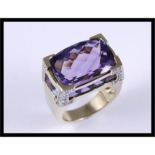 Gorgeous ring with 1 amethyst that weighs 15.48 carats and 44 diamonds that weigh 0.40 carats set in 14K yellow gold. The size 7-1/4 ring measures 21 millimeters (13/16 inches) long x 13 millimeters (1/2 inch) wide and weighs 9.49 grams total weight.
