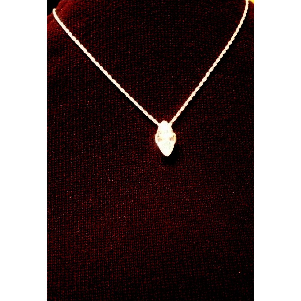 This pendant sparkles so much with reflecting colors of purple and green. Approximately 1/2 to 1 inch long and 1/4 inch wide. The delicate silver color chain has a 3 inch extender. It is marked "S O" and Avon.