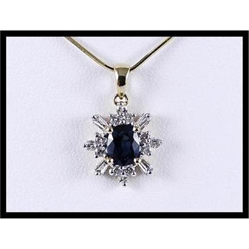 Gorgeous pendant with 1 sapphire that weighs 0.85 carats, 4 baguette cut diamonds that weigh 0.08 carats and 12 diamonds that weigh 0.20 carats set in 18K yellow gold. The pendant measures 12 millimeters (7-16 inches) wide x 18 millimeters (11/16 inches) high with bale and weighs 1.00 gram total weight.