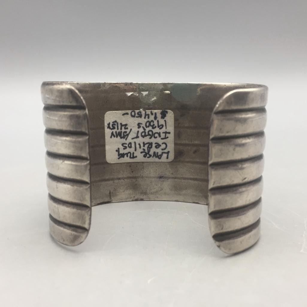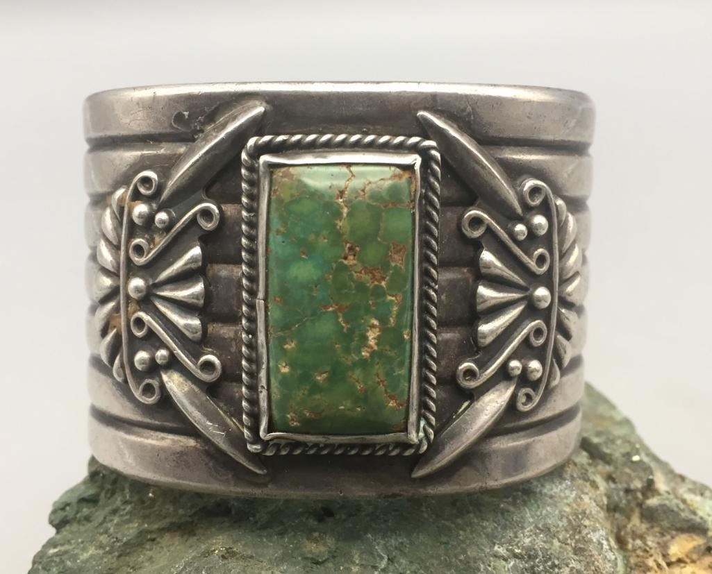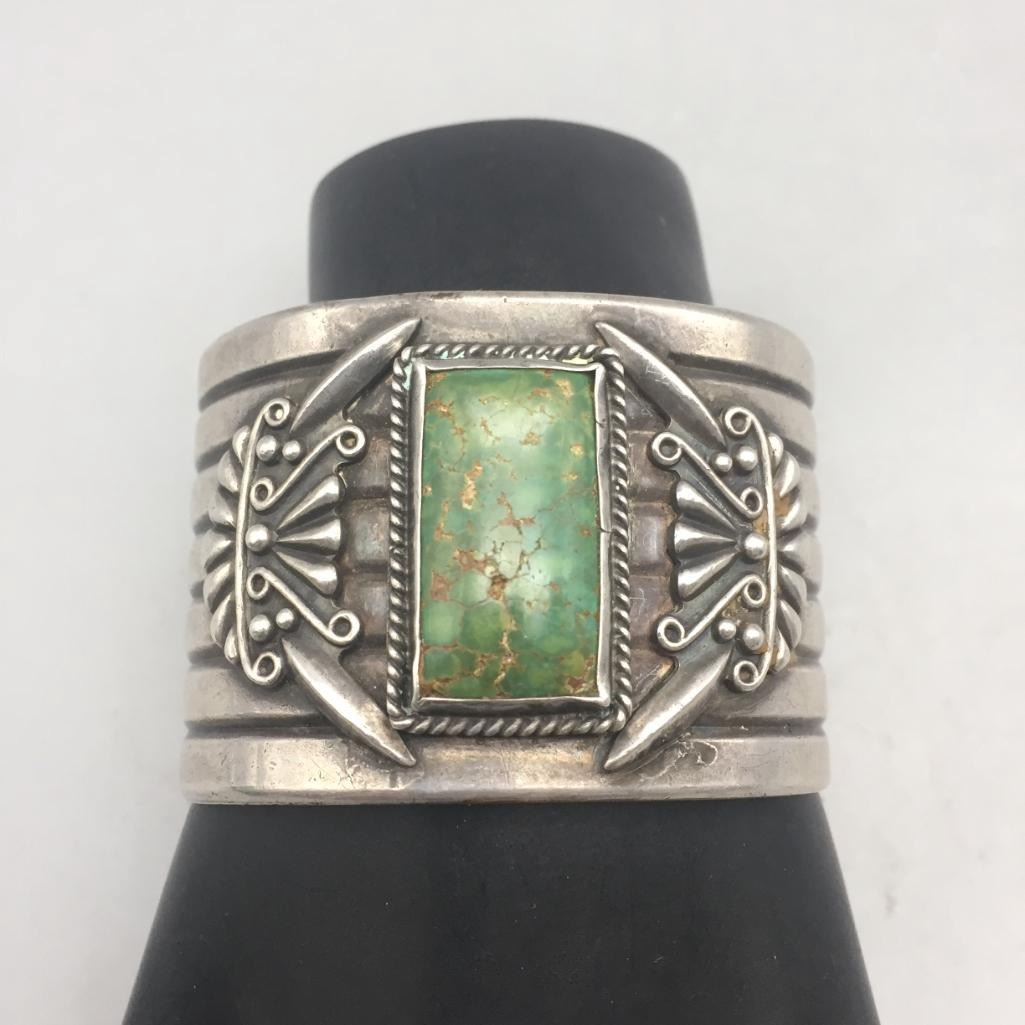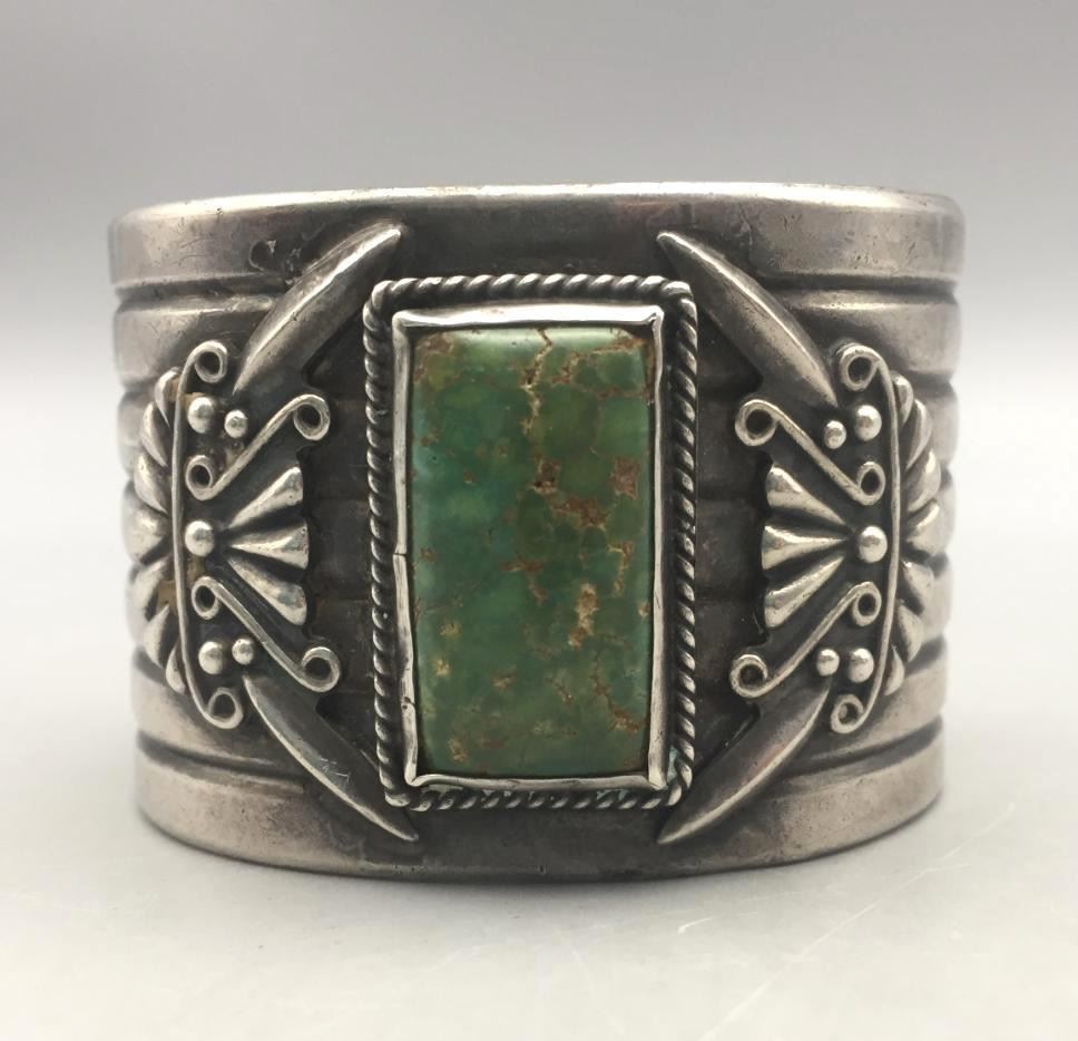 Description: Here is a stunning bracelet with a handmade ingot band, and unique appliqué accents on each side of the stone. The cabochon looks to be from the Cerillos turquoise mine. It is sterling silver. Maker: Unmarked. Approx. Age: Circa 1930. Size: Inside circumference measures approx. 5-1/2 inches with an additional 1-1/8 inch opening (making it fit an approx. 6-5/8 inch wrist.) It is 1-3/4 inches wide at its widest part and weighs 112 g. Condition: Good for its age. Normal wear and minor imperfections expected on used and vintage items. Please look closely at the pictures as they are an important part of our description. Shipping: There will be a $5 handling / packaging fee for shipping this lot. The actual cost of postage will be added on top of that. BUY IT NOW: If you would like to buy this item now without waiting for the auction to end (this option is only available up to 48 hours before the auction starts to close), the “Buy it Now” price is the high estimate of this lot. If you would like to end the auction early and pay the high estimate (plus applicable fees), please contact us by phone or email and reference this lot number.
