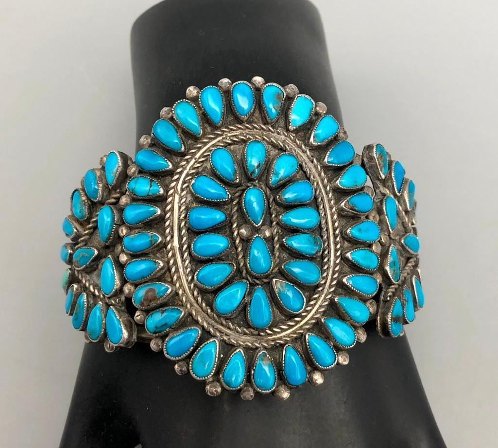 Here is a gorgeous 1950s-1960s turquoise cluster bracelet. This is a great bracelet set with spectacular blue petit point cut turquoise cabochons (petit point is term were the stones are cut in a teardrop shape). It is accented with twisted wire and silver dots, and it is sterling silver with a good weight to it. A few of the stones on the lower side appear to be sunken in. MAKER: Hallmarked with a Hogan (on a silver plate). APPROX.AGE: Circa 1950-1960s. SIZE: Inside circumference measures approx. 5-3/8 inches with an additional 1-3/8 inch opening (making it fit an approx. 6-3/4 inch wrist.) It is inches 2-3/8 wide at its widest part and weighs 66.2 g. CONDITION: Good for its age, normal wear expected. Please look closely at the pictures as they are an important part of our description and are hereby incorporated into the description, specifically with regards to condition. SHIPPING: There will be a $5 handling / packaging fee for shipping this lot. The actual cost of postage will be added on top of that. BUY IT NOW: If you would like to buy this item now, without waiting for the auction day to bid on it, we do offer this option (which is available up to 48 hours before the actual auction starts). The “Buy it Now†price is the high estimate of this lot (plus applicable fees and the Buyer's premium is discounted to 10% when using the Buy it Now option). If you would like to exercise this option, you must contact us by email (or phone as long as you talk to someone live). Reference this lot number and your intention to "Buy it Now."