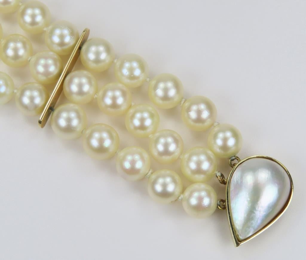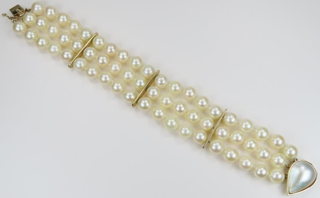 measuring approx. 7.50 MM in diameter with Ivory color with blush overtones accented with 3 gold bar spacers and organic shaped Mobe Pearl clasp crafted in 14 karat yellow gold.
