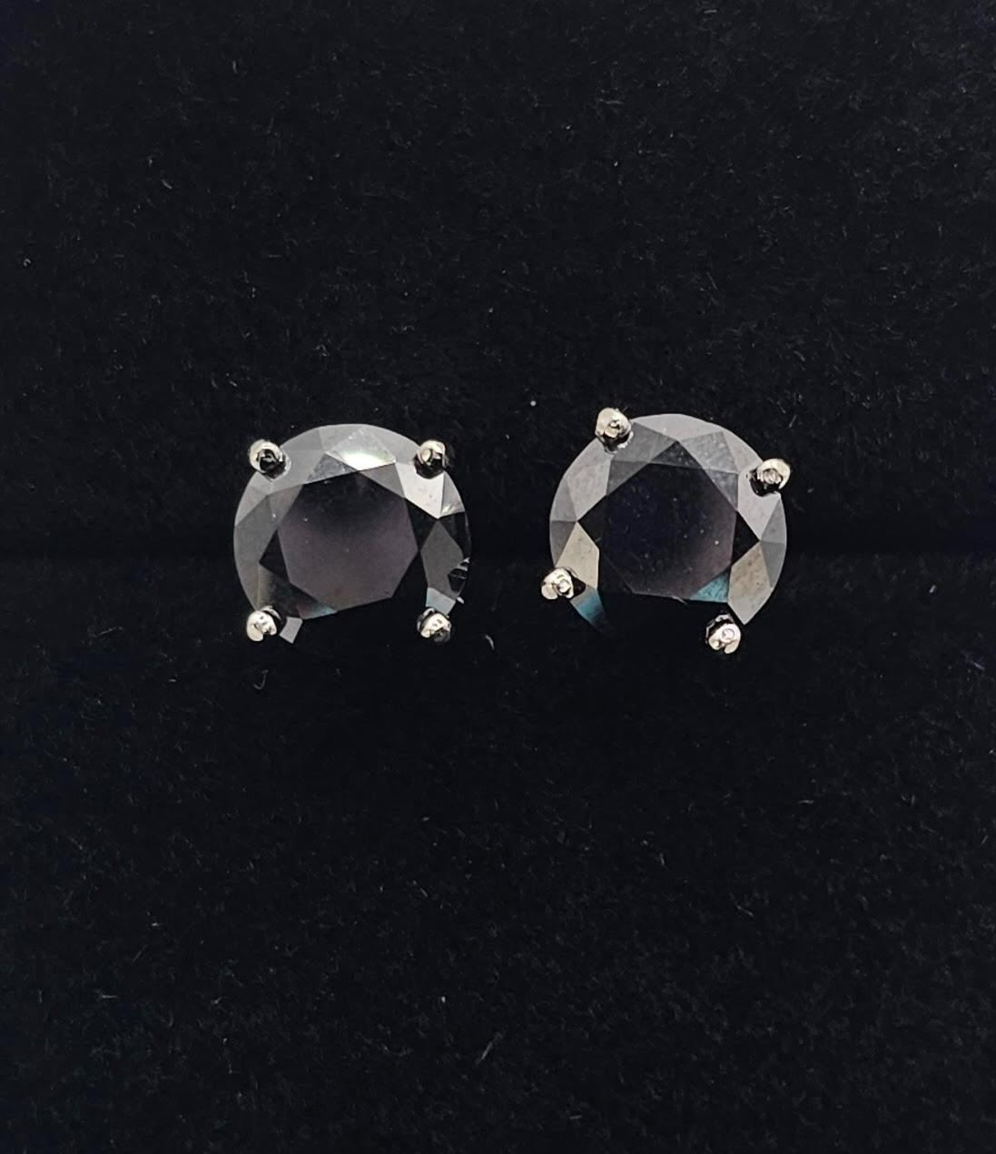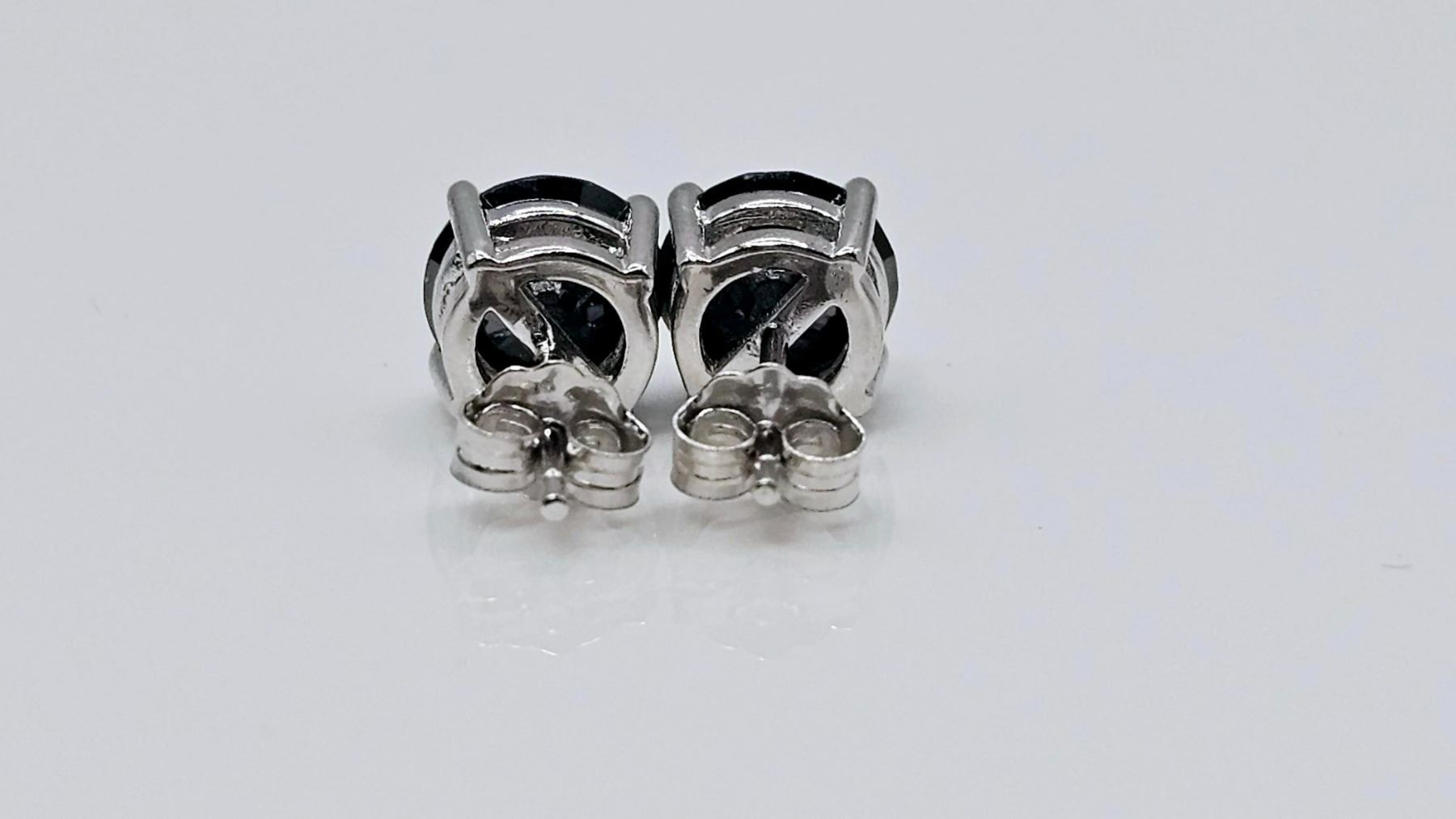 These 4 Cttw Lab Simulated Diamonds are Silky Black In Color along with a mirror like finish. They are both 8mm. Brilliant Round Cuts. Mounted in 14 Kt Tri-Layered White Gold over Solid .925 Sterling Silver. With a refractive index of 2.65-2.69, these gemstones exhibit more brilliance than a natural diamond thanks to a dispersion that is 2.4 times higher. These exceptional simulated diamonds measure 9.25 to 9.5 on the mohs hardness scale and will test positive for a diamond with almost any diamond tester, Not to mention they are Earth Friendly and Conflict Free! The total gram weight for the pair 2.3 grams.