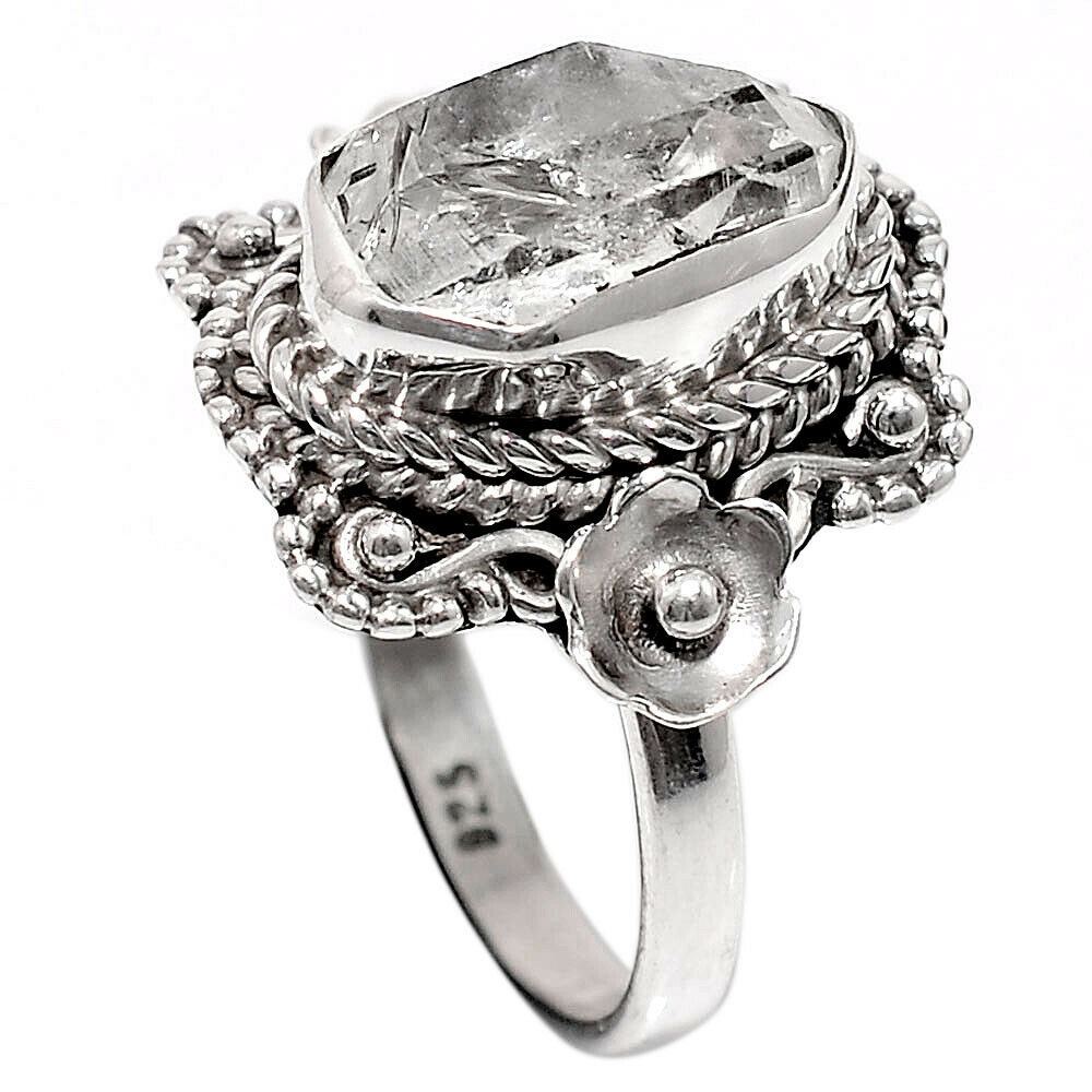 Gorgeous 4 ct Herkimer Diamond Ring. Mounted in Elaborately Designed Solid .925 Sterling Silver. Size 7 1/2. Total Gram Wt Is 4.6 Grams.These Highly Desired Gemstones Turn Heads.Herkimer Diamonds are Rare double terminated quartz crystals found only in a small are of Herkimer County, New York. This seems to be the Only Place that exact right conditions are to make these Beautiful Jewels. A double terminated crystal has points on both ends instead of just one end. These special crystals were first discovered in the early 1800's by settlers in New York and were named Herkimer diamonds due to their diamond-like shape. A typical Herkimer diamond has 18 facets: six upper, middle, and lower facets. They are also known for being Very Bright and Incredibly Clear.