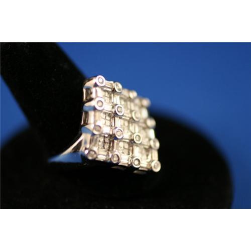 This is a dramatic and positively sparkling ring! Brilliant cuts and baguettes, totalling .70 cts are set in shining 18K white gold.  The square curves slightly up at the ends- the diamonds catch light from every angle.  This wonderful ring is a size 7 (sizable by me or by your jeweler) and weighs 4.5 grams.