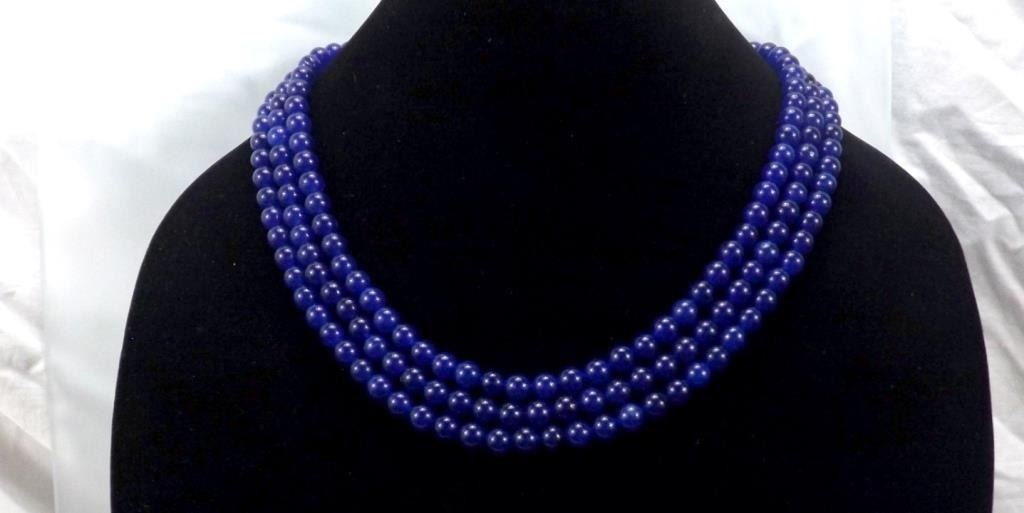 Beautiful Rare Natural 984.5 Cttw. Mined From The Earth 3 Strand Blue Sapphire Necklace. These fine polished beads are approx 8 mm. and are near perfect round. The neck size is adjustable from as small as 16" to 28".Treated to enhance color.