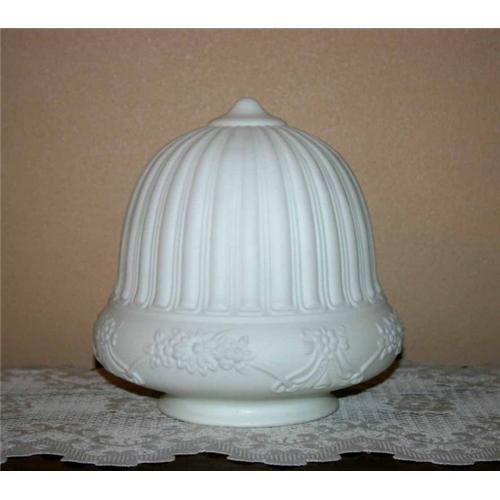 From the early 1900s this is a gorgeous antique white encased glass ceiling light shade that originally hung in a local church until the late 1920s. Shaped similar to an acorn the inside of the shade is encased in glass with a beautiful draping floral design on the outside bottom rim. Quality glass with a fabulous ring when tapped; this antique ceiling light shade stands 10 ¼ of an inch tall, measuring 5 7/8 in diameter where the light shade attaches to the fixture and 10 inches wide. Gorgeous and in MINT condition!