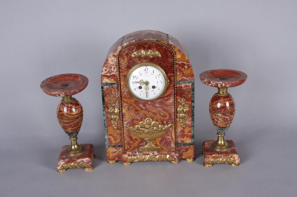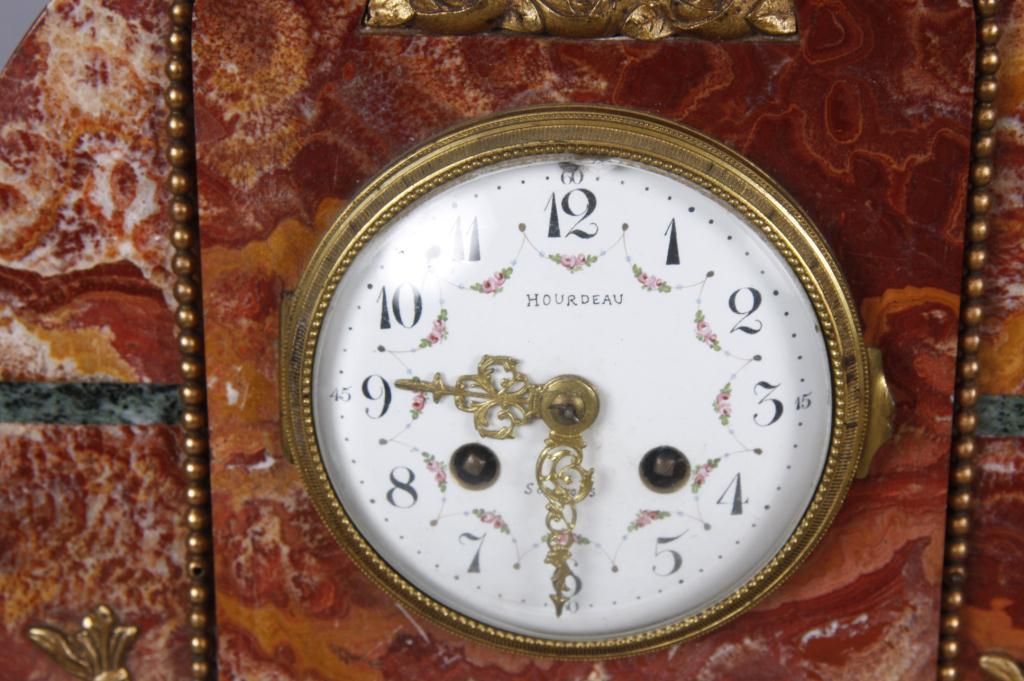 Gorgeous Antique "Hourdeau" 3 Piece Clock SetBeautiful red marble case with brass ornamentation, ha