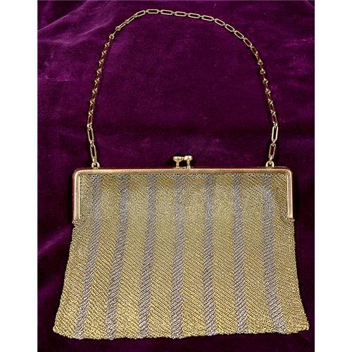 <Our item number 140809><B>Art Deco Gold Mesh Evening Purse.</B> 14 carat white and yellow gold in alternating vertical stripe design. Size 6 x 5 inches. Topped by a 6 x 1 1/2 inch gold frame with two gold mounted sapphire clasps and a 7 1/2 inch gold chain. Inscribed on inside of frame is "Selma Schricker / 1430 Clay Street / Davenport Iowa" Maker "Lebolt 14". Total gold weight 298.8 grams. <BR>Estimated Value $7,000 - 8,000. <BR><BR>Our item number 140809<BR><IMAGES><P ALIGN="CENTER"><IMG SRC="http://www.goldbergcoins.net/liveauction/49jpegs/140809.jpg"> </P></IMAGES>