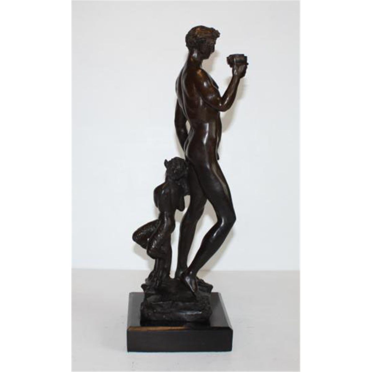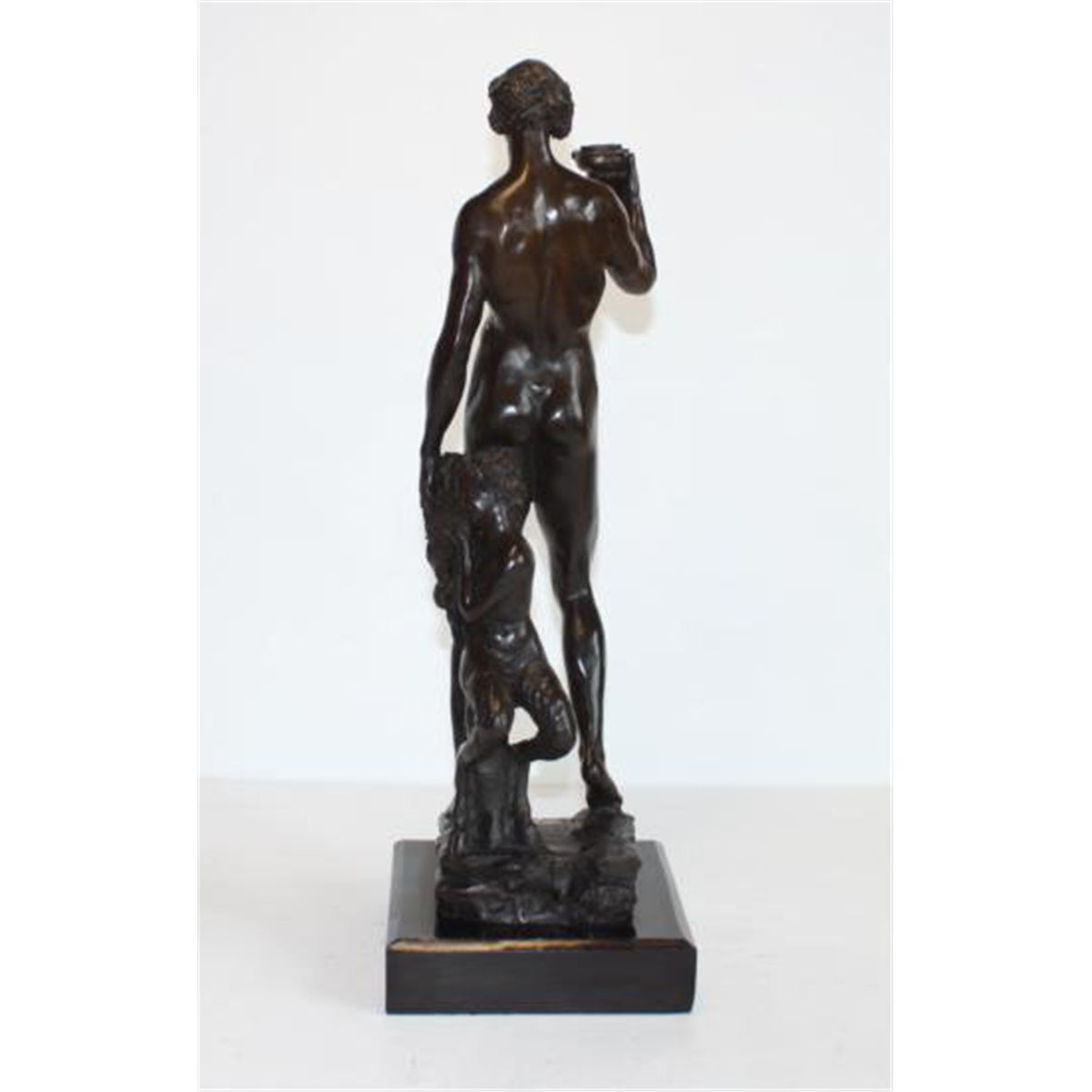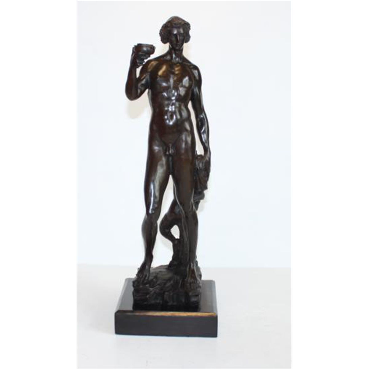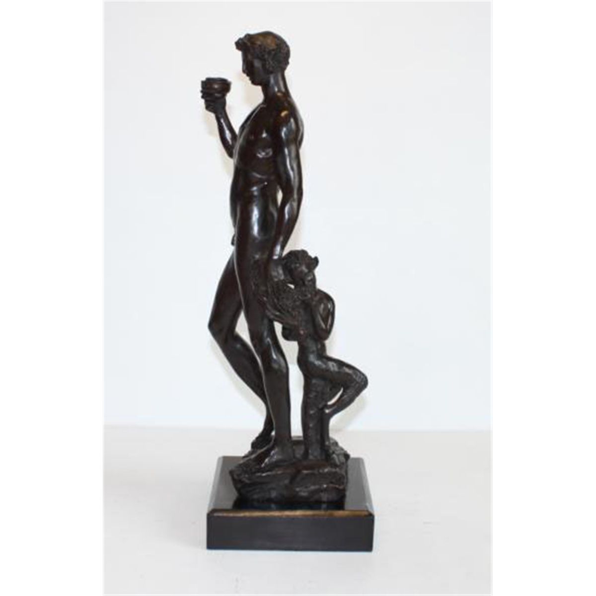Bacchus Bronze Sculpture, After Encachepe, 19"H x 7 1/2"D x 7 1/2"W 18 lbs. This bronze sculpture was produced using the "Lost Wax" casting method. The"Lost Wax" Cast method is the most precise metal casting technique in existence, ensuring exquisite detail of the original host model which is usually sculpted in clay or wax. This "Lost Wax" casting method is an extremely labor intensive and expensive process, but the end results produce a Heirloom Quality Masterpiece!