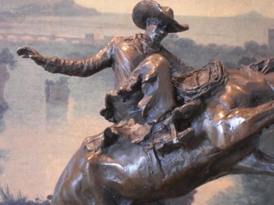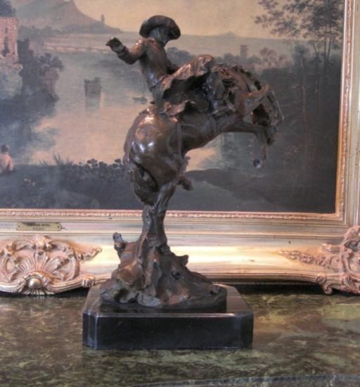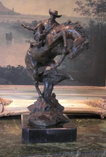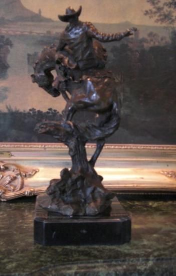 Cowboy and Rearing Horse, Bronze Sculpture, After Lobo, 15"H x 9"W x 7"D 22 lbs This bronze sculpture was produced using the "Lost Wax" casting method. The"Lost Wax" Cast method is the most precise metal casting technique in existence, ensuring exquisite detail of the original host model which is usually sculpted in clay or wax. This "Lost Wax" casting method is an extremely labor intensive and expensive process, but the end results produce a Heirloom Quality Masterpiece!