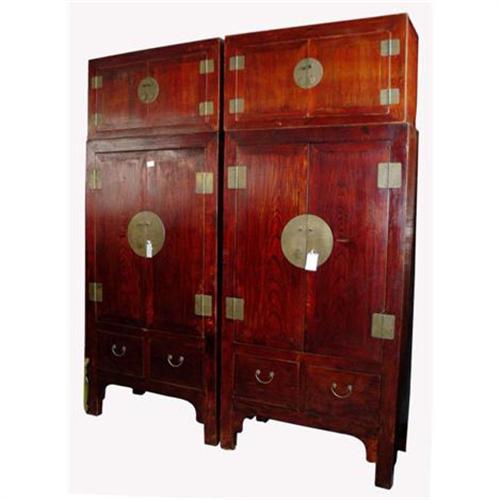 The antique furniture is a pair of exquisite chinese Qing dynasty's wardrobes made of wood gathered from Shanxi province in China.A wonderful piece for a room that can hold it.At the beginning of the Qing Dynasty, furniture followed Ming patterns and styles.Qing Furniture showed its own uniqueness with the absorption of western art. It was larger in size with grandeur and pageantry.Engraving was a popular and important means of furniture decoration. The subjects range from auspicious character patterns, to geometric patterns and scenes in nature with animals, mountains and waters, flowers and grass. Color painting, especially gold painting, was widely used.Commercial symbols emerged, such as patterns concerning money and fortune.To later Qing furniture has less engraving ,instead ,inlays of stone, porcelain and bone, which catch the eye more easily than exquisite engraving, are used to tell of the luxurious lifestyle of the owner. In addition, color and gold painting become the vogue depicting the preference for gaudiness by the wealthy.