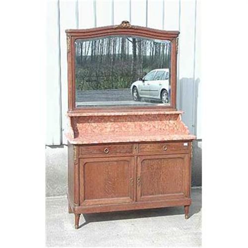 This is a Beautiful Marble Top Oak Dresser in the Napoleon III style. Made in Belgium around 1900 it is in great condition. Nice Brass details on all edges and feet including the Crest on the mirror. It has two drawers and two bottom doors which open up to a large cabinet area with one long shelf inside. Absolutely beautiful orange spotted tan marble with side pieces and small marble shelf. Beautiful beveled mirror compliments the rest of the piece. The Dresser comes with a key to lock the bottom cabinets and the lock does work. This piece is very clean and very well built. Good quality piece of furniture that is ready to be place in your home. For additional photo's or information on this piece please contact us by clicking on the "EMAIL DEALER" button, we'll be happy to supply you with any information on this piece that is requested including a shipping quote if needed. Thank you for looking.