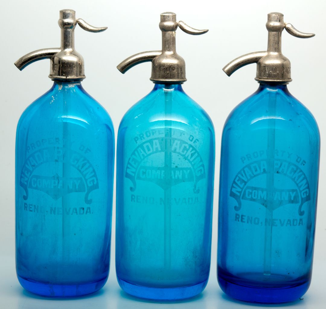 These cobalt seltzers are gorgeous: light cobalt, deep blue, and a rare cornflower color. Each is 12” tall, with matching tops, and etched “PROPERTY OF/ NEVADA PACKING/ COMPANY/ RENO, NEVADA.” On front. Bottoms marked “MADE/ IN/ CZECHO-SLOVAKIA”. No chips or cracks. Intact siphon tubes. The cornflower bottle still contains a little liquid. -60178