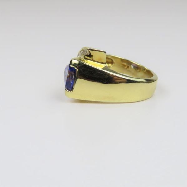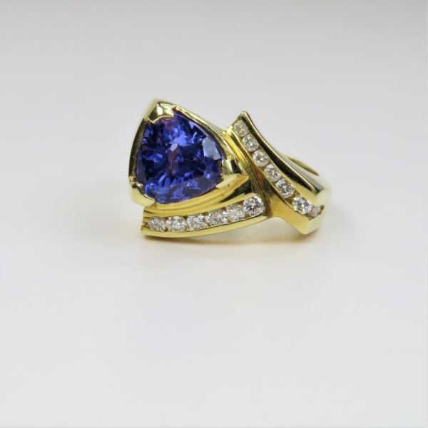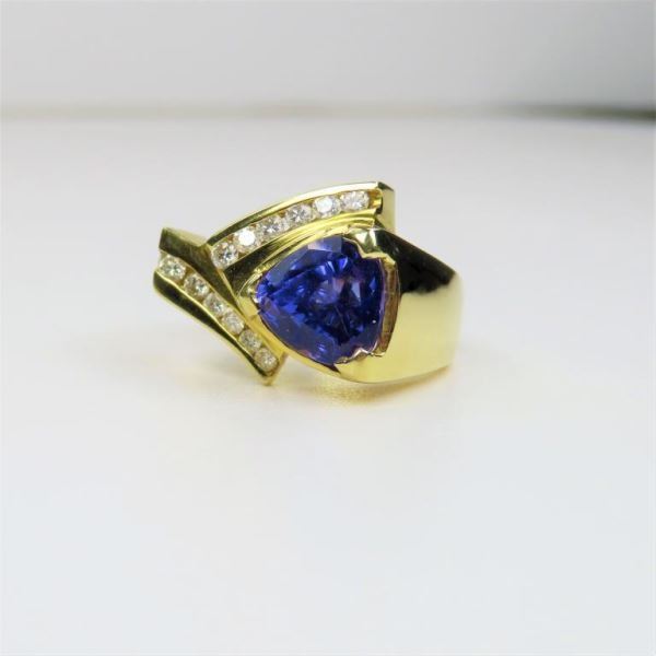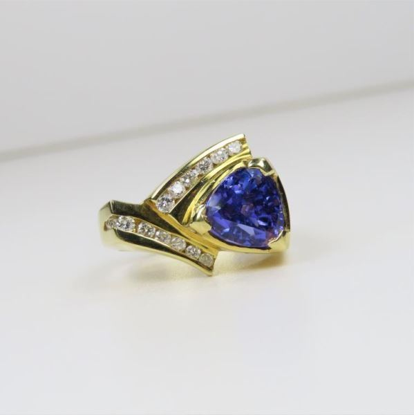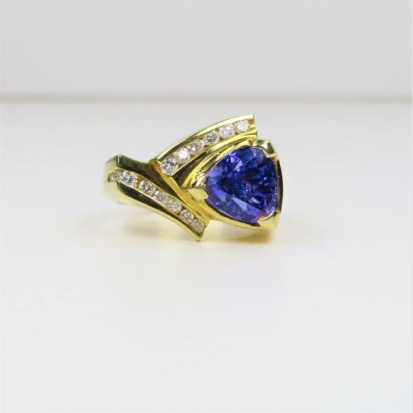 Diamond Ring featuring a vivid Purple/Blue Tanzanite weighing 4.90 carats (stamped inside shank) accented with 14 round channel set Diamonds weighing approx. 0.50 carats with G-H colors and VS/SI clarity set in a custom crafted 14 karat yellow gold setting. Retail $7,000-$8,000