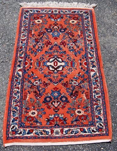 Gorgeous design hand woven semi antique Persian Sarouk. Size 4.3 X 2.2 feet, made of fine quality lamb's wool pile on cotton foundation, all natural vegetable dye, incorporating a free flowing floral pattern on a rich red background; centerpiece medallion; and an intricately done floral border. Hand woven in Sarouk, Iran.