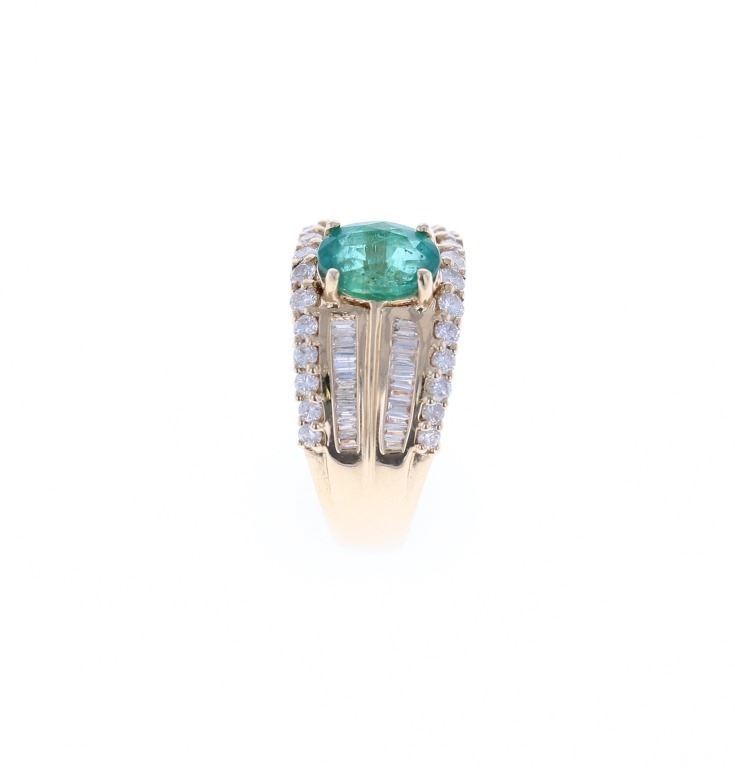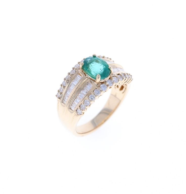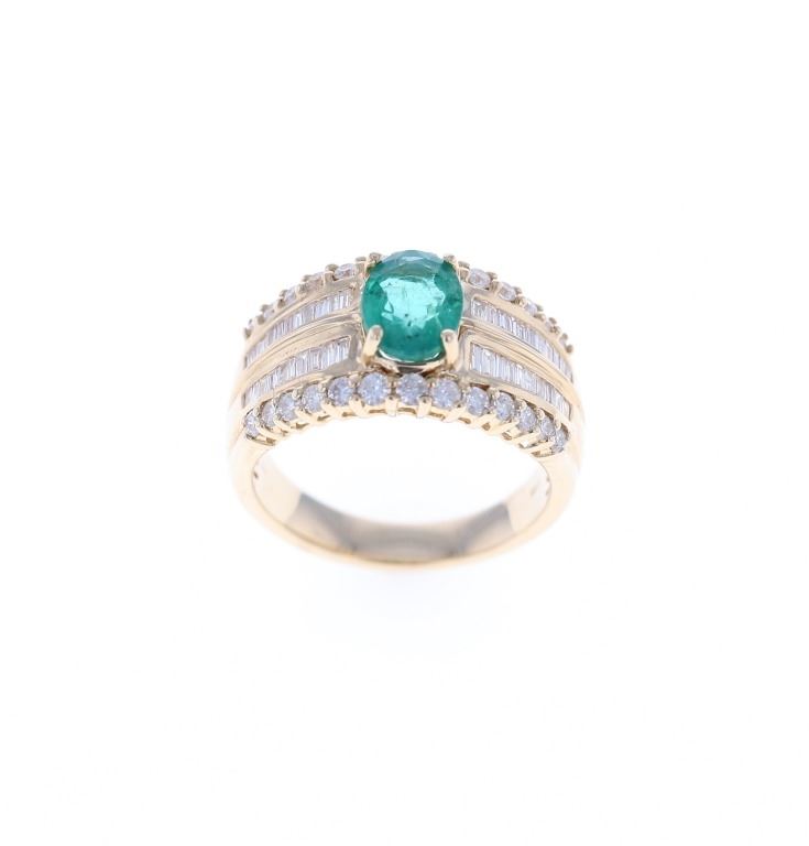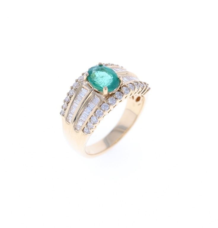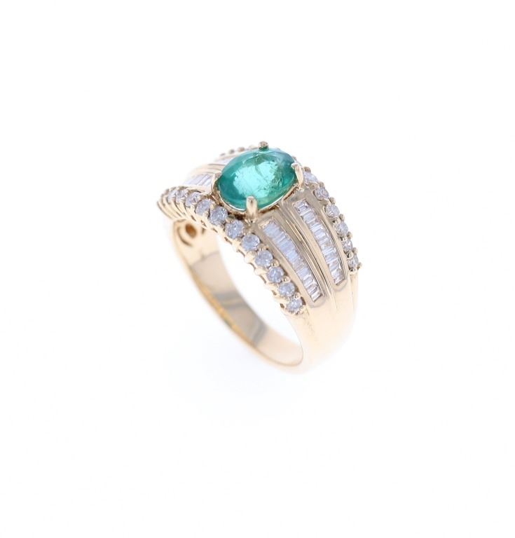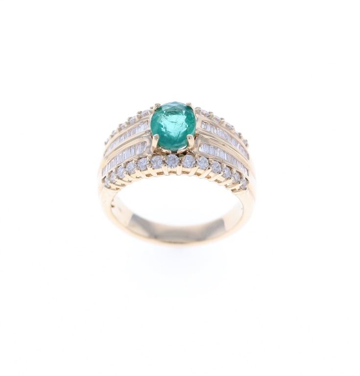Featured in this lot is this gorgeous emerald and diamond 14k yellow gold ring. The ring features a wonderfully and professionally crafted 14k yellow gold construction that features the 'CJ' hallmark on the inside of the ring band and is marked '14k' on the other side. The ring features a center stone of a oval cut emerald faceted cabochon that shows great eye clarity and a light green hue of coloration. The thick ring band is profusely decorated with round brilliant and baguette diamonds that show good eye clartiy and transmits light wonderfully and shows a total of 26 round cut and 41 baguette diamonds that shows a total diamond weight of 0.82 carats. The condition of this ring is good with no obvious signs of damage and shows good overall condition. The ring size is US 7.