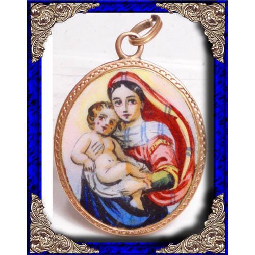 This wonderful old pendant is 2 sided with the portrait of Madonna and Baby Jesus ( also called Madonna of the poor) on the front. Set in 14kt rose gold this 1 1/3? long ( includes bale) has written on the back ?SZ Maria Isten anyja imadkozz erettunk? on the back (ST. MARY MOTHER OF GOD - PATRON SAINT OF HUNGARY). The Pendant is in great shape and the detail on this is very beautiful.