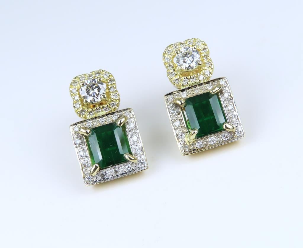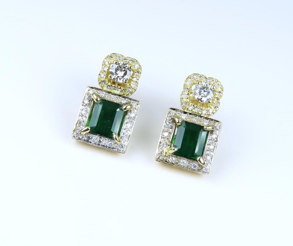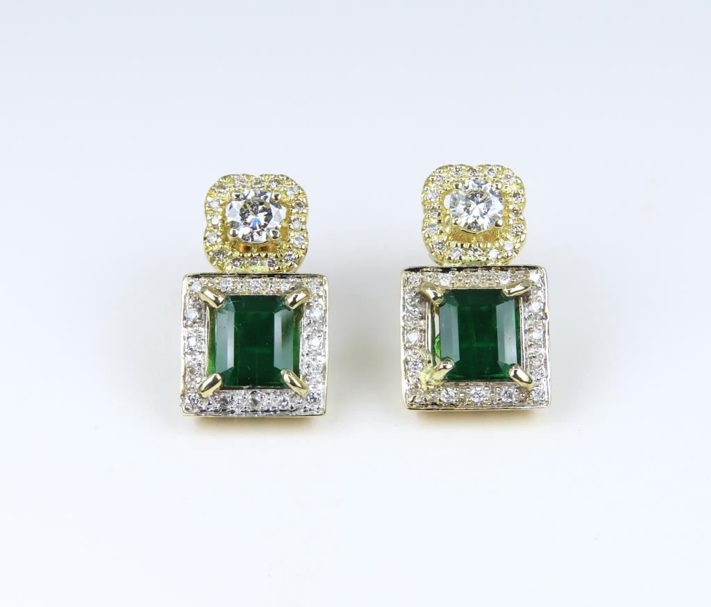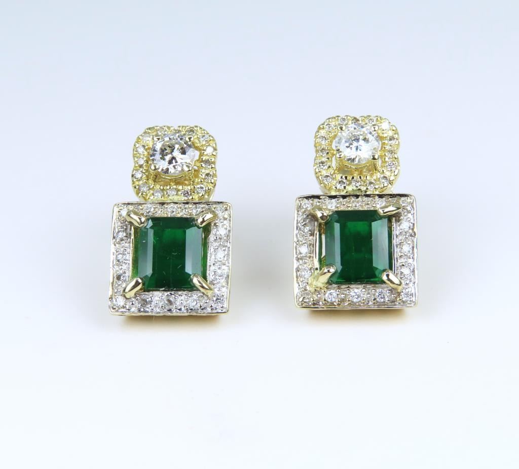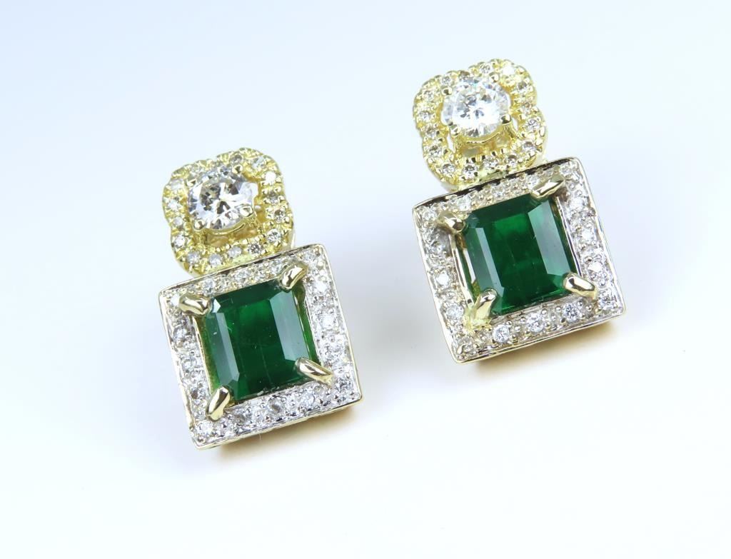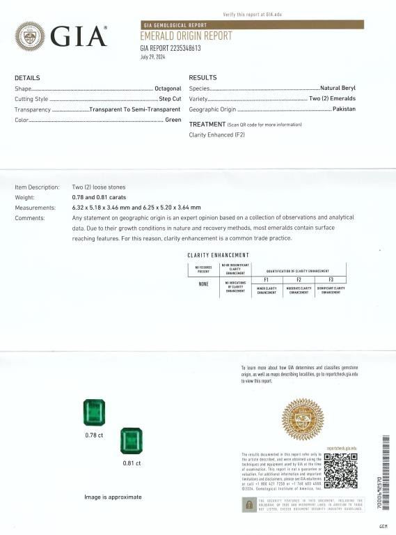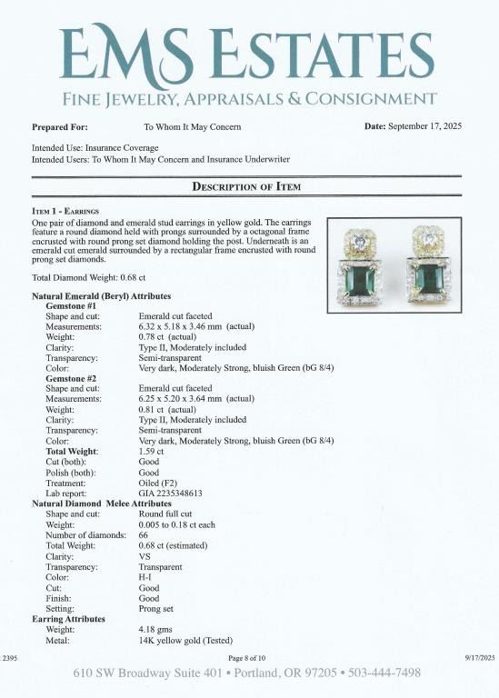 featuring 2 matching G.I.A. Certified Pakistan Emeralds with extra rich vivid Blue Green color weighing 1.59 carats combined, accented with 66 round Diamonds weighing approx. 0.68 carats with H-I colors and VS clarity set in elegant custom crafted 14 karat yellow gold settings. Full Retail Appraisal - $9,800.00